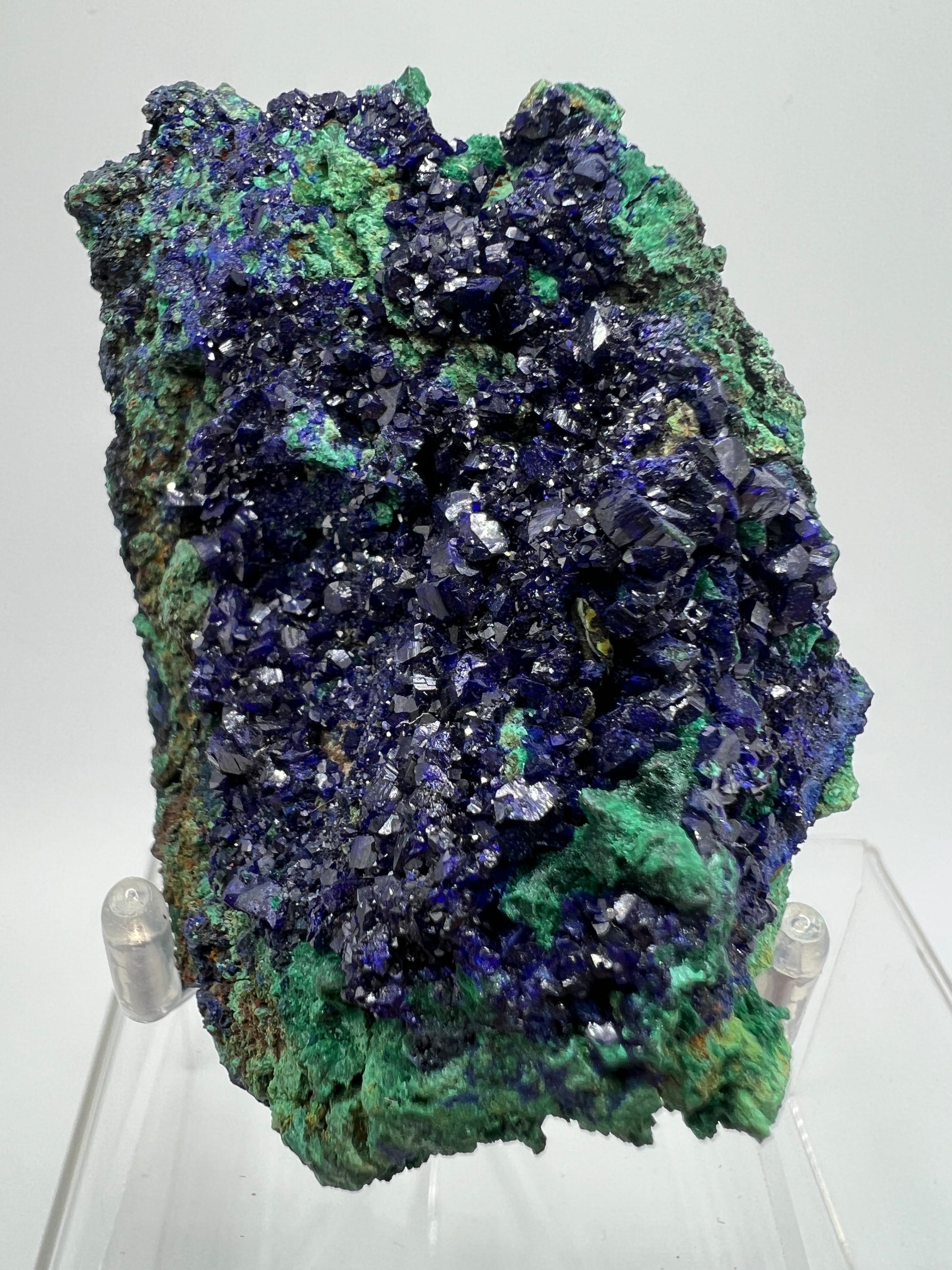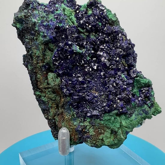 Transform your collection with this stunning Azurite and Malachite Specimen. This rare cluster features high quality Azurite crystals and beautiful Malachite formations. The striking colors will add a unique touch to any display. Don't miss out on this beautiful multi mineral cluster! Very nice specimen display stand is included.