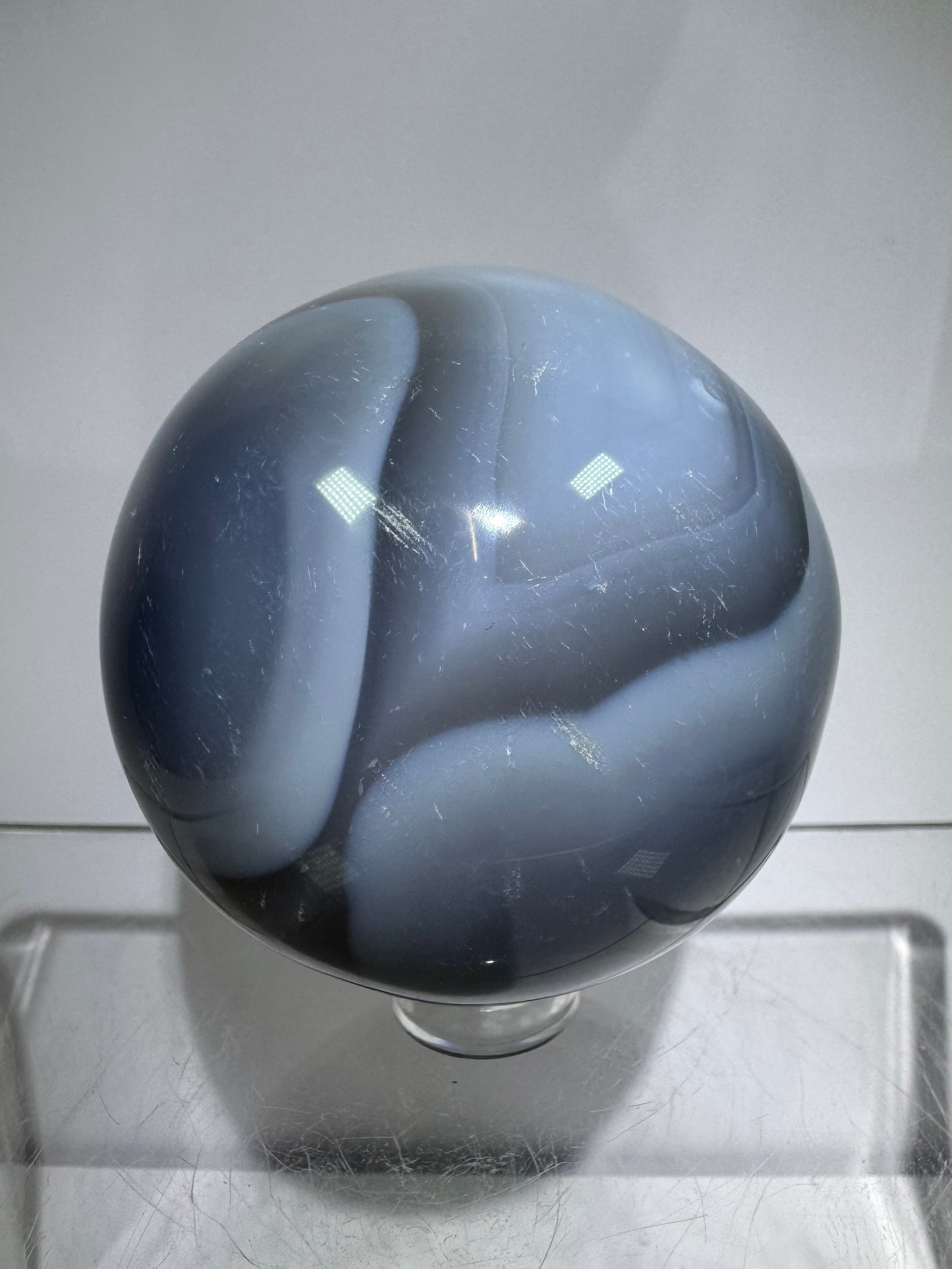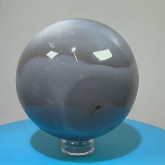 Expertly handcrafted from stunning banded agate found in Madagascar, this 57mm sphere showcases gorgeous colors and intricate banding. Bring a touch of natural beauty to your space and harness the calming and harmonizing energies of blue agate with this beautiful display piece.
