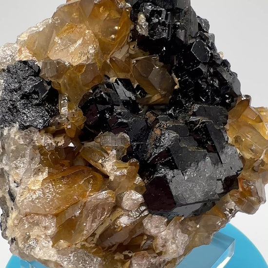 This rare African specimen features a stunning combination of black tourmaline and citrine clusters, originating from Erongo Namibia. With touches of UV reactive Hyalite opal, this crystal formation is truly one of a kind. Add this amazing piece to your collection and experience the unique benefits of these crystals. Very nice specimen display stand is included.