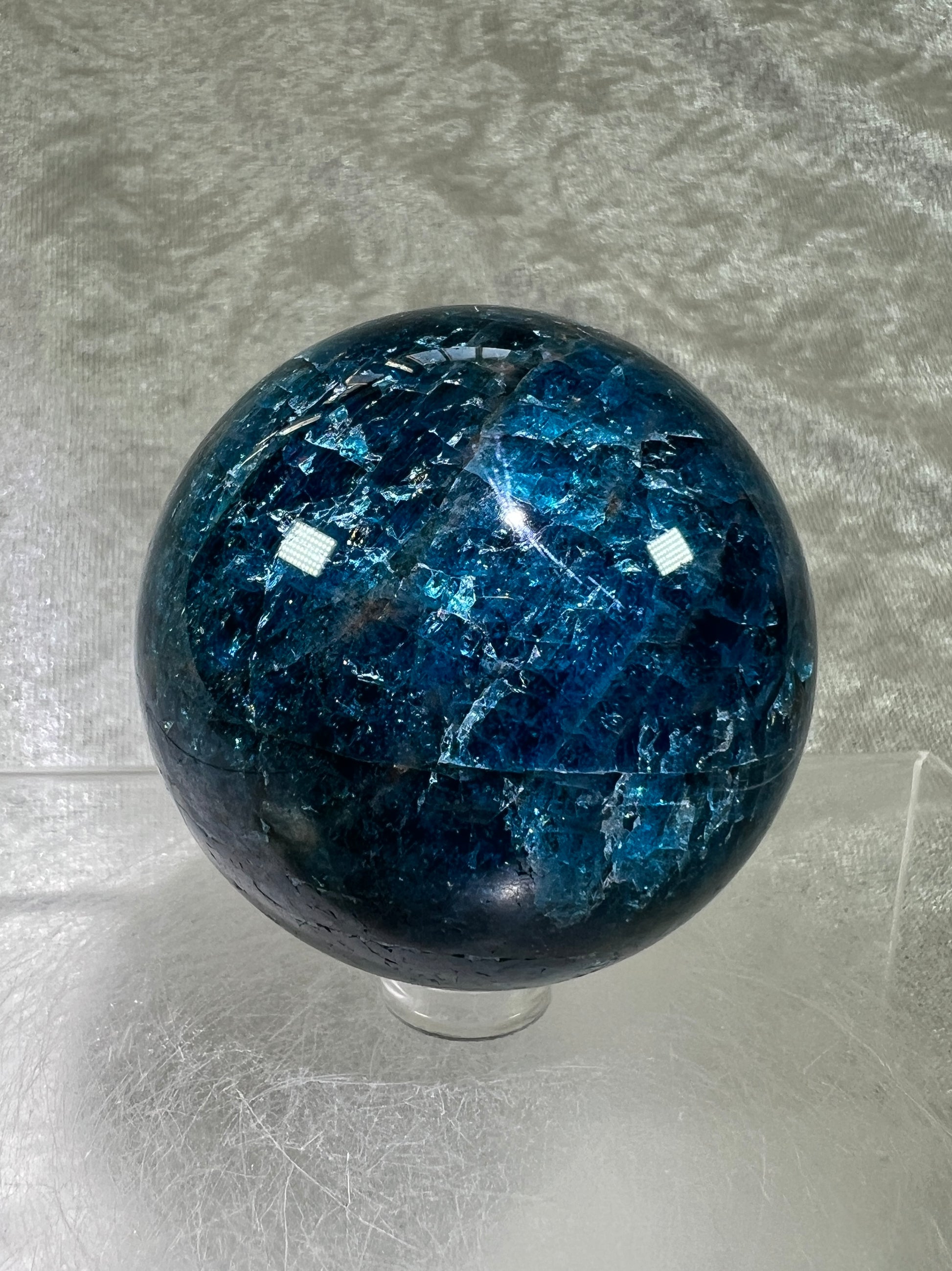 Blue Apatite Crystal Sphere. 58mm. Gorgeous Deep Blue With Lots Of Iridescent Flash. High Quality Display Sphere