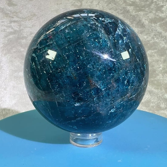 Add a touch of magic to your crystal collection with our Blue Apatite Crystal Sphere. Its deep blue color and iridescent flash make for a gorgeous display piece. Very high quality, this sphere is a must-have for any crystal enthusiast.