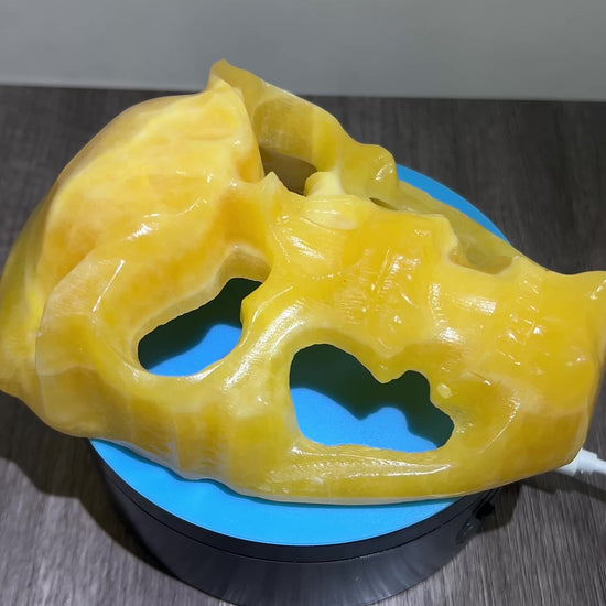 Add a bold, mystical touch to your collection with this hand-carved orange calcite crystal skull mask. Crafted from genuine orange calcite, this piece highlights the stone’s natural glow and unique patterns. Each carving is one-of-a-kind, with detailed features that make it both captivating and eerie.
