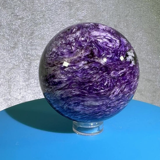 This rare and exquisite Charoite Crystal Sphere, originating from Siberia, Russia, boasts high quality and stunning patterns. Its microcline inclusions create an amazing UV reaction and its flash adds to its unique beauty. A must-have for crystal collectors and enthusiasts alike.