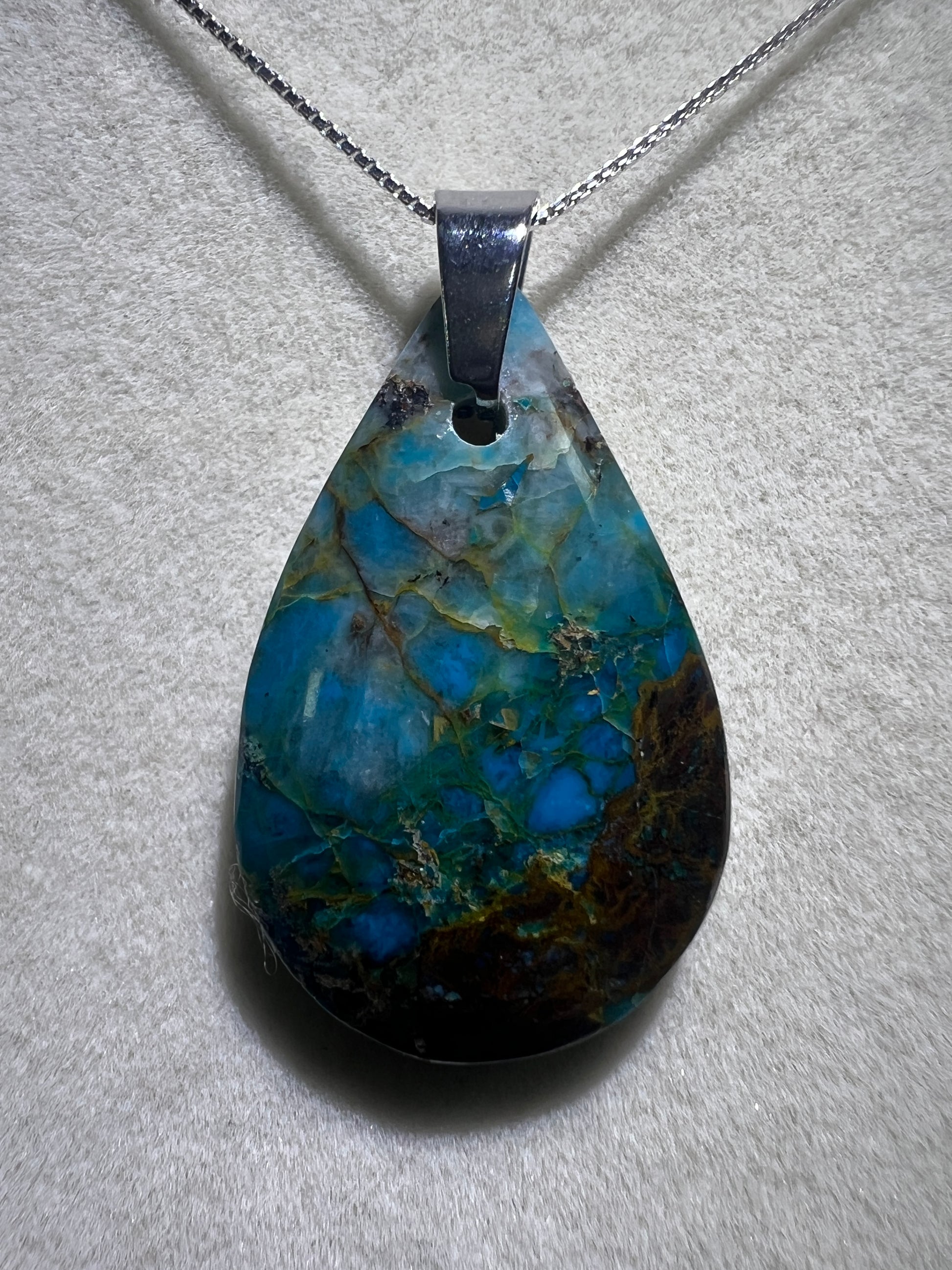Chrysocolla Teardrop Pendant. Rare Water And Wine Chrysocolla From Peru. Stunning Color Combination. Includes S925 Silver Necklace.