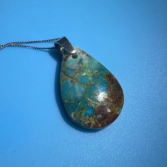 All natural stunning Chrysocolla crystal pendant. This water and wine vein of Chrysocolla is only being used for jewelry. Stunning blue Chrysocolla with a wine red matrix. Gorgeous Crystal Jewelry from Peru. Also includes a high quality S925 silver 18 inch necklace. Don’t miss out on this rare and amazing crystal necklace.