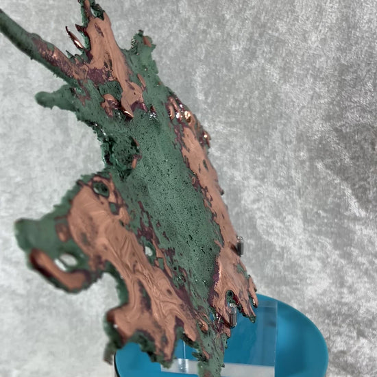 Oxidized splash copper. Native copper from Michigan is used to make these artistic freeform sculptures. Splash copper is made by pouring molten copper at 2300 degrees onto a flat surface. When the shape is cooled a green chemical patina is applied, then highlights are polished to expose the glowing copper underneath. The sculptures are then sealed to preserve the finish and prevent tarnishing. Amazing One Of A Kind copper display piece. A very nice specimen display stand is included.