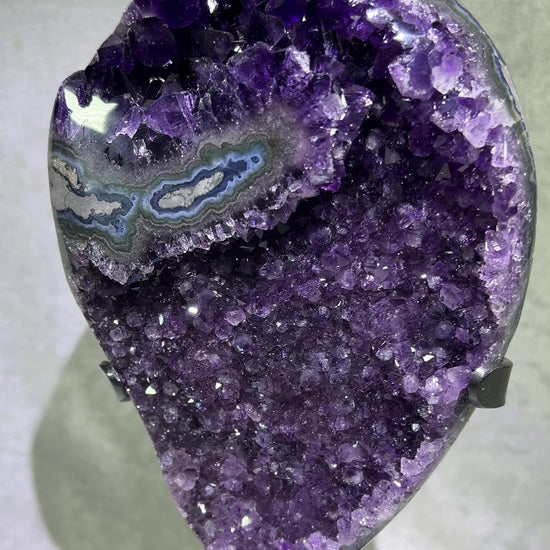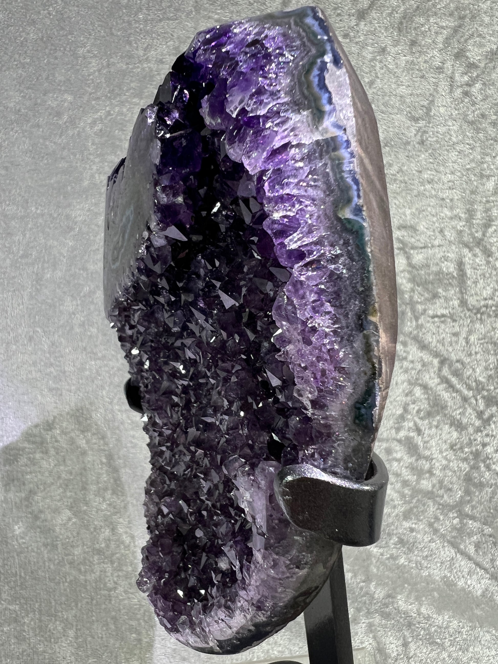 Elevate any space with our Amethyst Geode specimen from the famous Las Torres Mine in Artigas, Uruguay. This gorgeous AA quality specimen boasts a deep purple hue, stunning crystallization, and beautiful colorful banding. Custom made steel stand is included. A true world-class statement piece for any collection. Don’t miss out on this one of a kind display crystal. Sizes and weights are for the crystal only. 9.75 inches tall with stand.