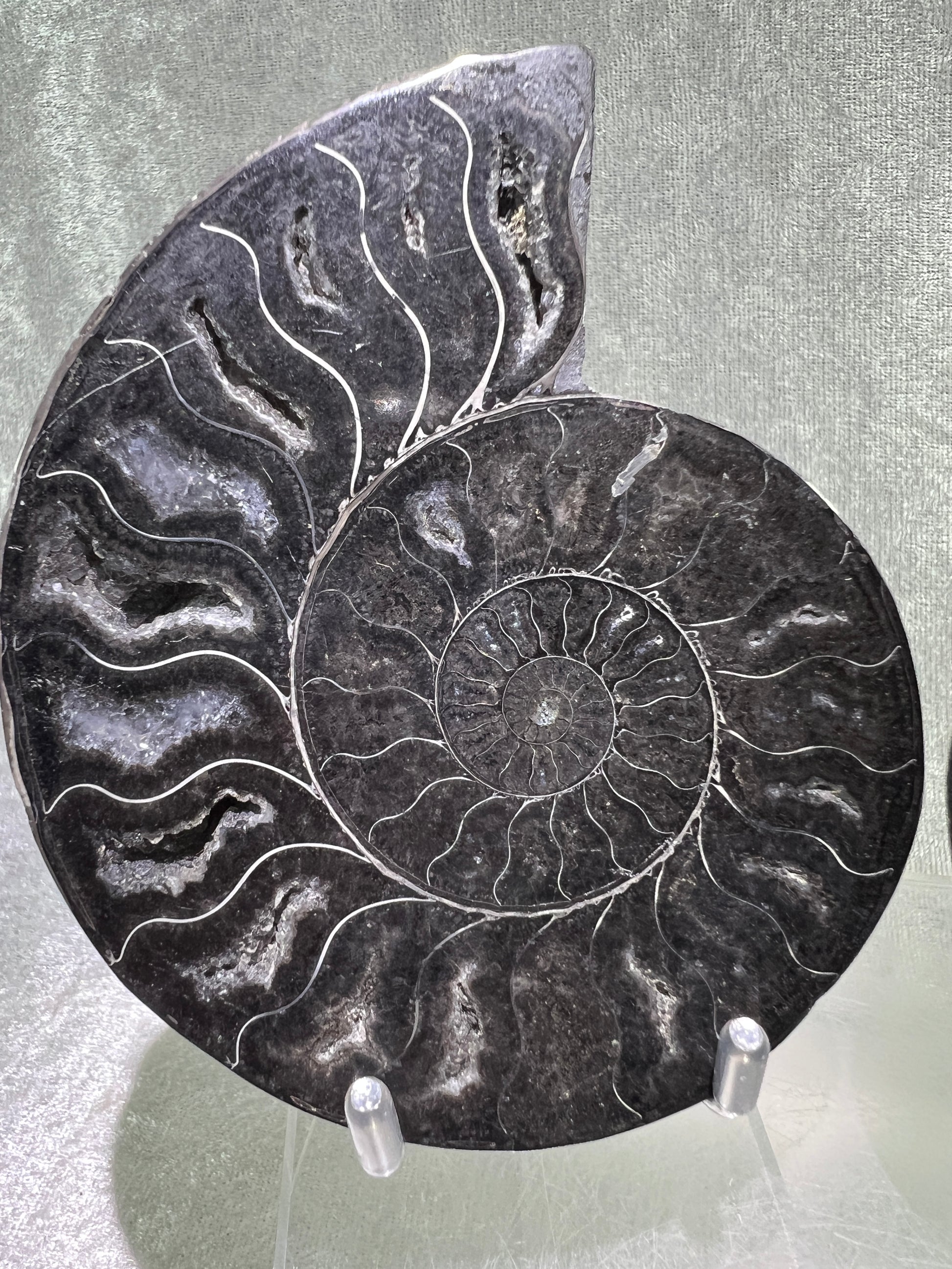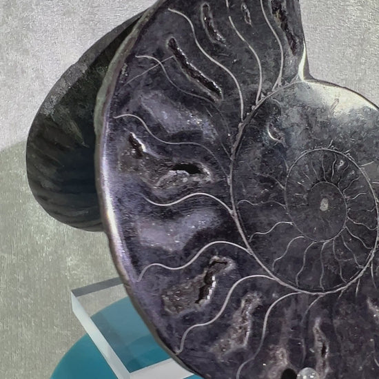 Very rare black Ammonite split pair specimen. Sourced from Madagascar, this high quality, polished fossil features gorgeous druzy and the rare black color. Amazing display specimen. Very nice specimen display stands are included. The size is for one side, and the weight is both combined.