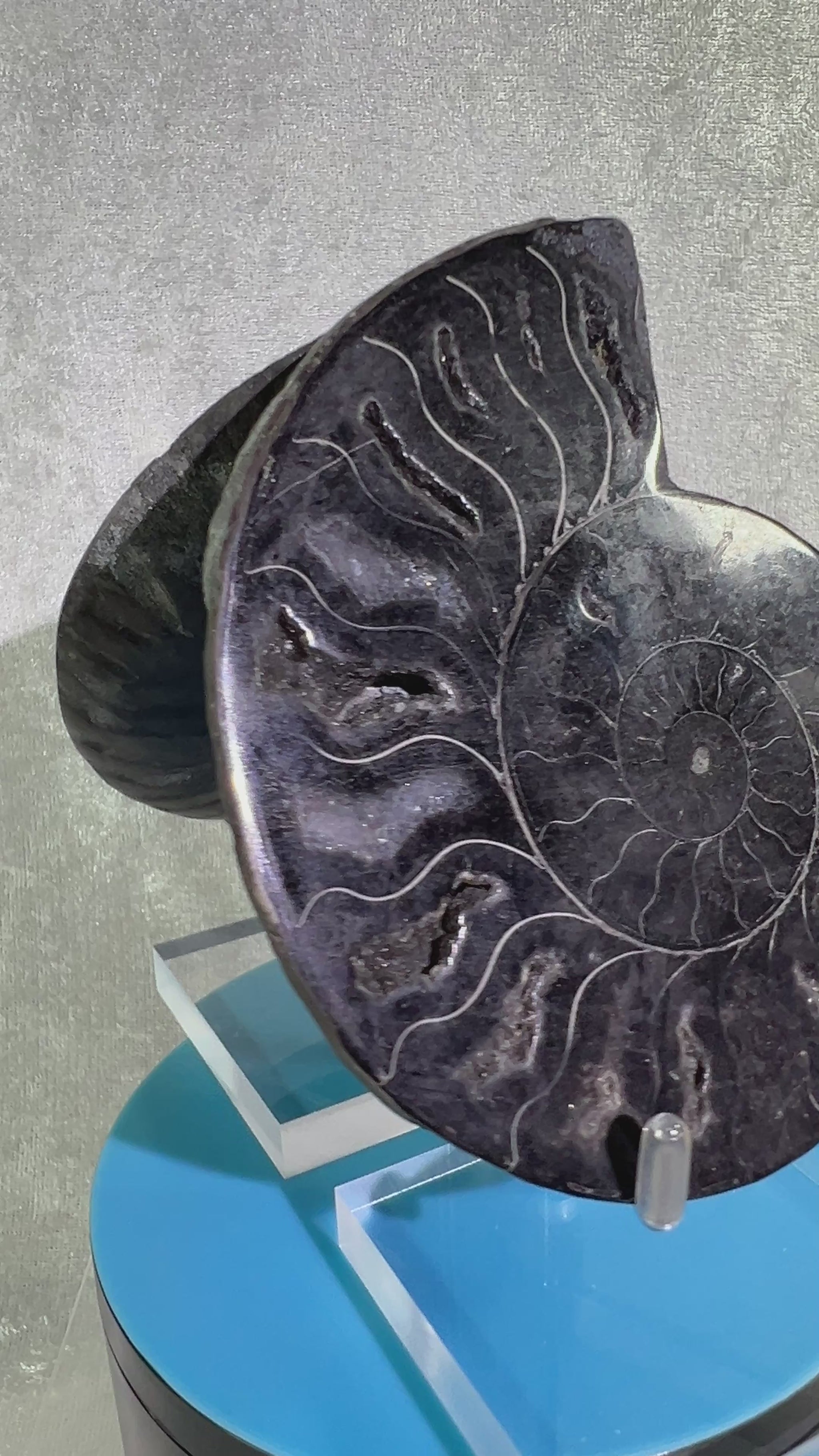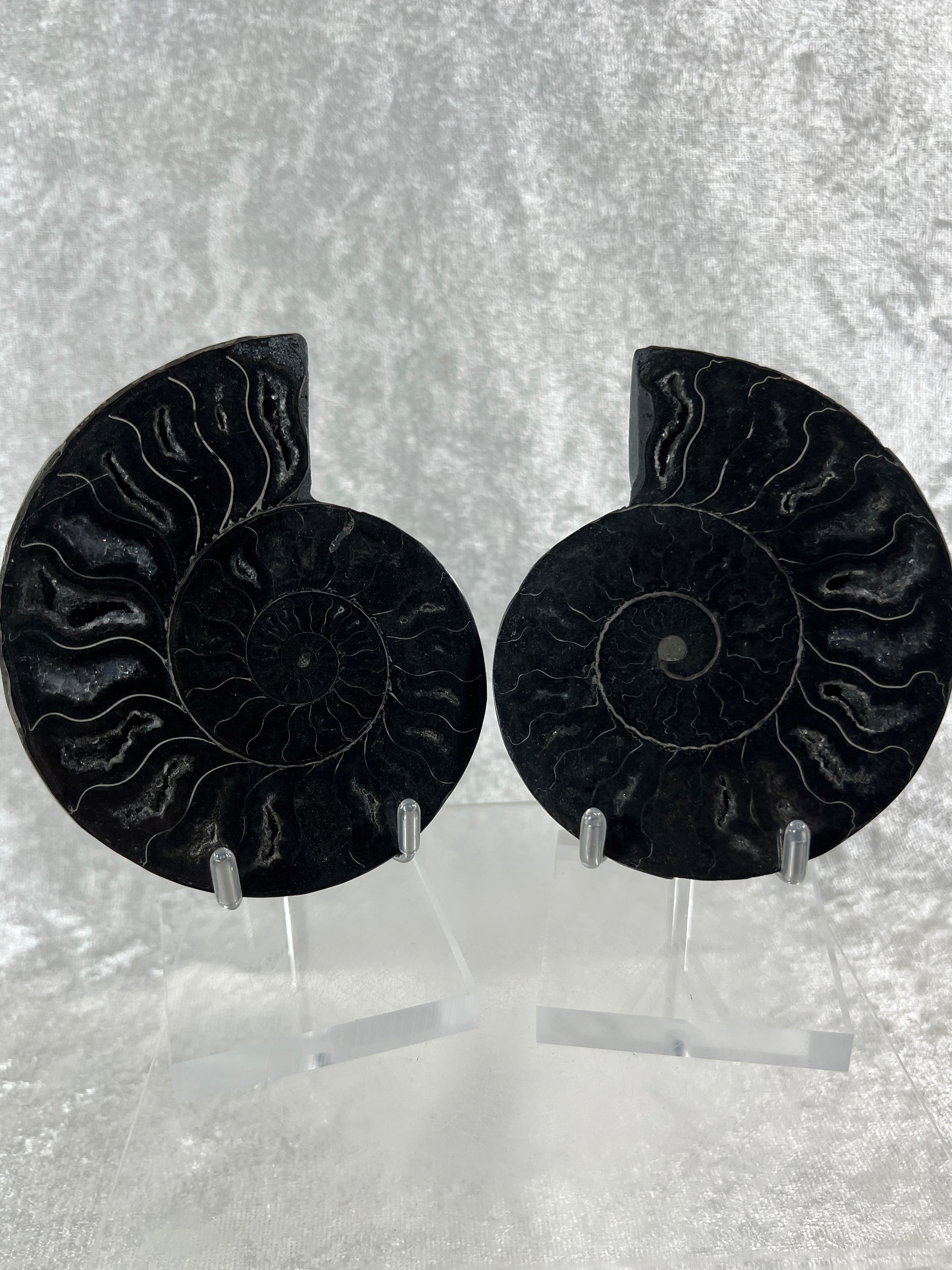 Black Ammonite Display Pair. Gorgeous Rare Fossil Specimen From Madagascar. Split And Polished With Amazing Druzy.