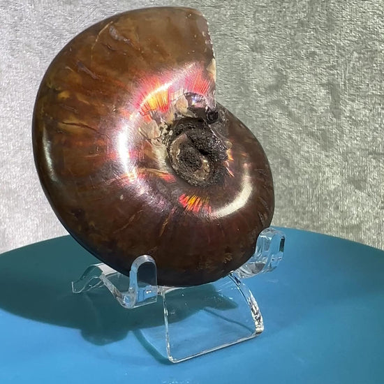 Discover the beauty of nature with our Ammonite Fossil Specimen. Sourced from Madagascar, this high quality, polished fossil features a stunning flashy mother of pearl layer that shimmers with red and yellow flash. Commonly sold as opalized ammonite, the flash is actually from the nacre(mother of pearl layer in the shell). A must-have for any collector, this beautiful and iridescent specimen will add a touch of wonder to your collection. Small clear display stand is included.