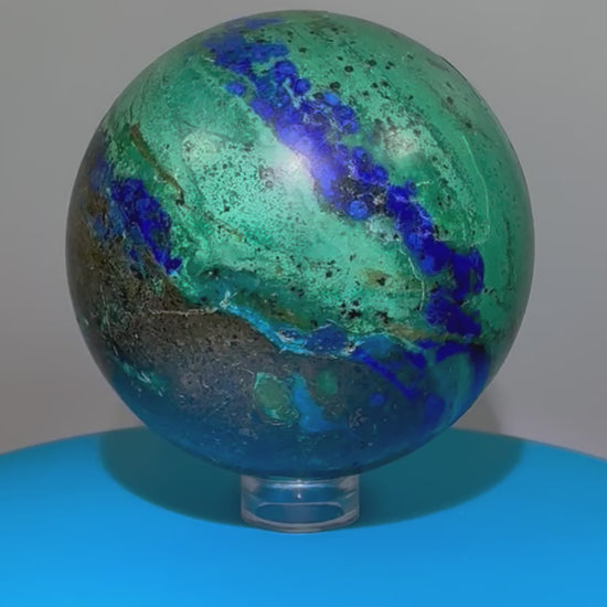 Experience the beauty of nature with our Azurite and Malachite Crystal Sphere. This rare and high-quality piece showcases stunning bright colors and patterns, making it a truly unique display item. Elevate your decor with this 61mm sphere and add a touch of sophistication and exclusivity to your space.
