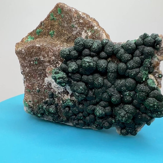This rare and stunning ball malachite specimen is a must-have for any mineral collection. Mined from the Mindingi mine in Kambove, Congo, this double-sided mineral display offers a unique and captivating look at the beauty and complexity of malachite. Don't miss out on the opportunity to own this amazing find.