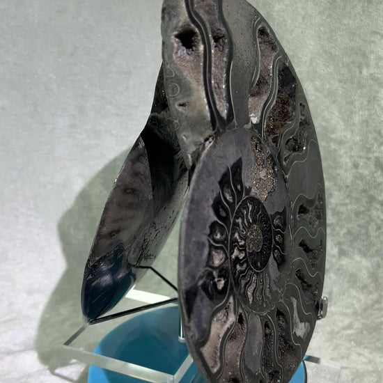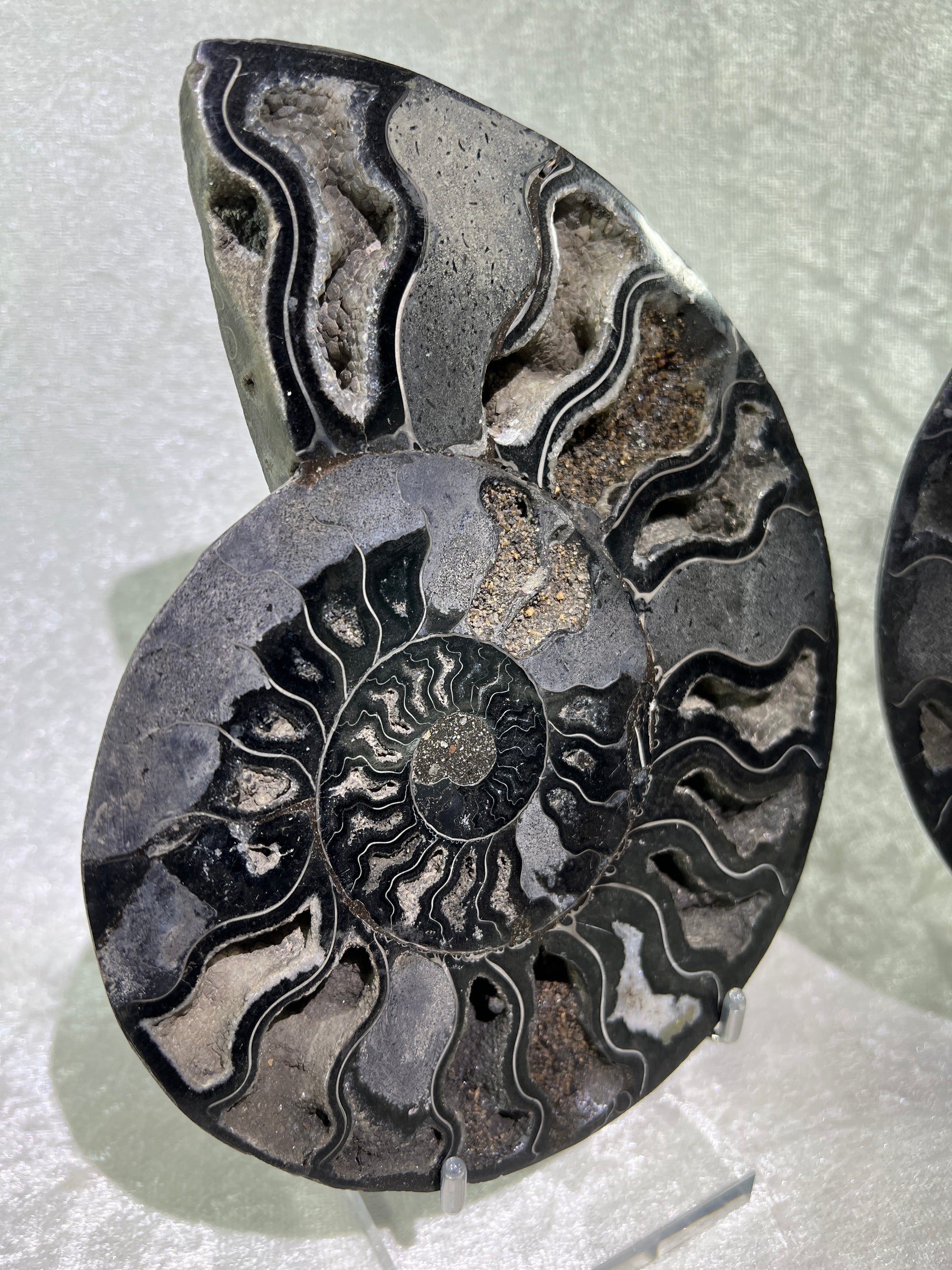 Extra large rare black Ammonite split pair specimen. Sourced from Madagascar, this high quality, polished fossil features gorgeous druzy and the rare black color. Incredible cabinet display specimen. Very nice specimen display stands are included. The size is for one side, and the weight is both combined.