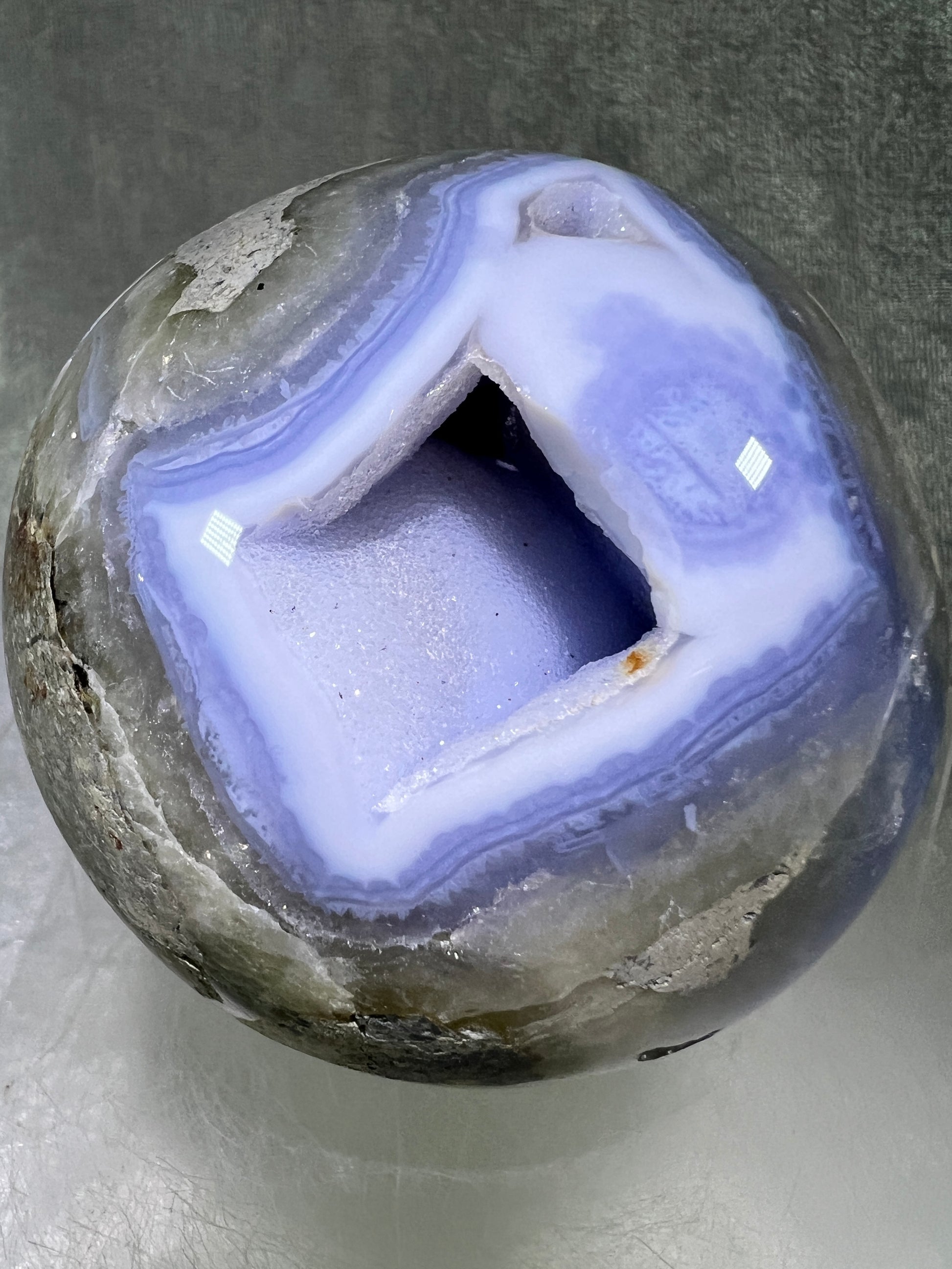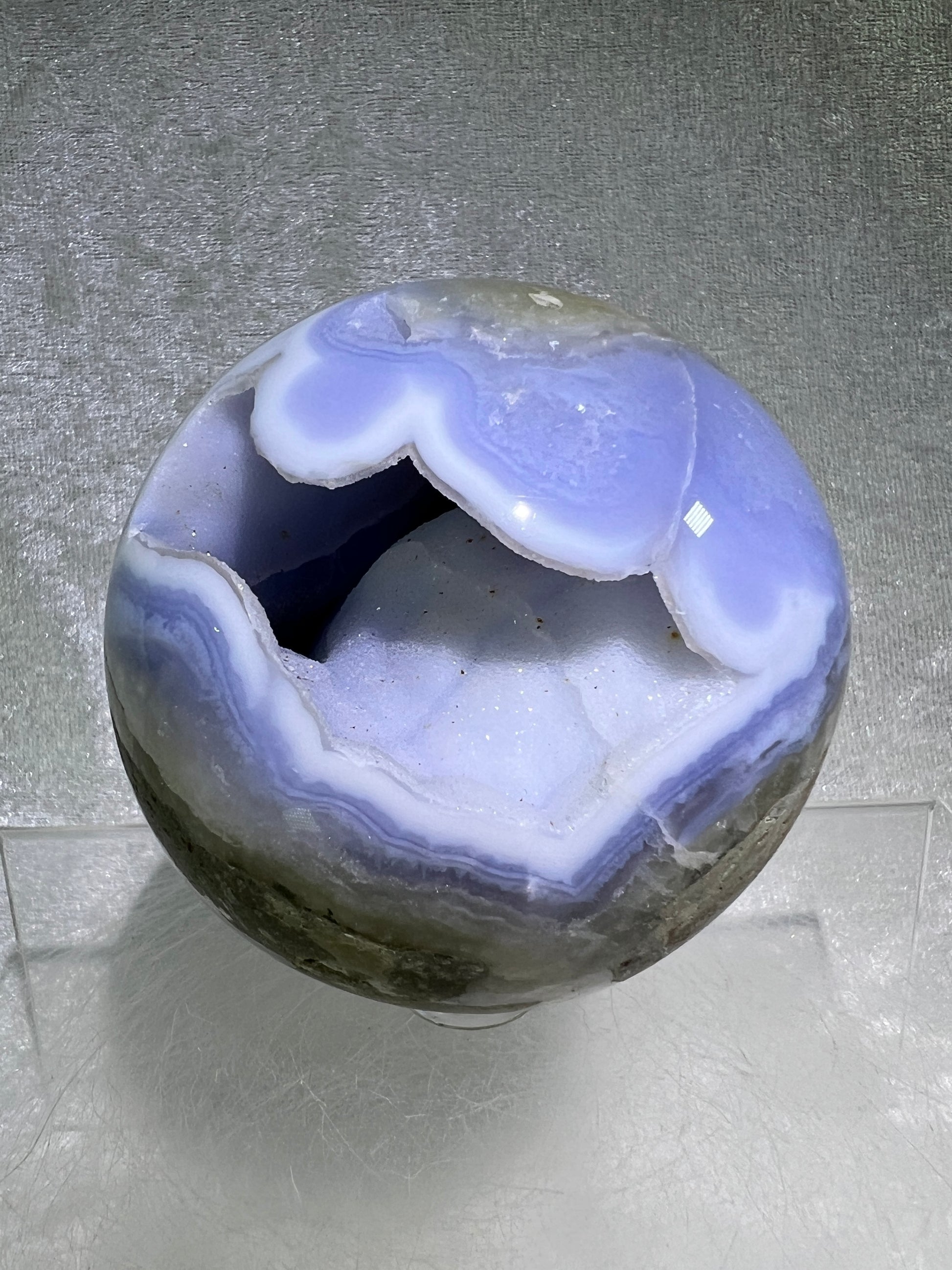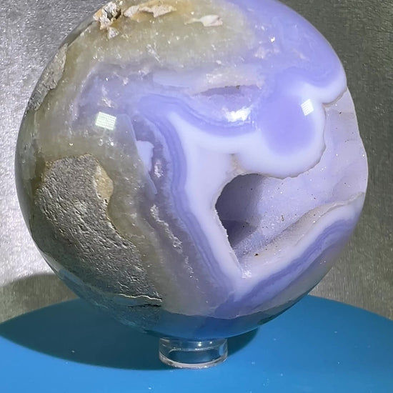 This Blue Lace Agate Sphere is both aesthetically stunning and incredibly rare. With its white sugar druzy accents, this sphere is a must-have for any collector. Hand carved beautiful sphere. Plus, its unique composition offers potential benefits such as promoting relaxation and reducing stress. Don't miss out on adding this truly special piece to your collection.