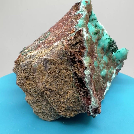 Copper Druzy coated Chrysocolla, with Malachite on a Dolomite matrix from the Lupoto Mine in Congo. Very, very rare! Stunning high quality display specimen. Amazing colors on this beauty. Don’t miss out.