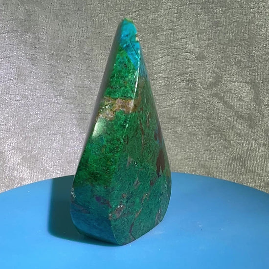 Discover the stunning beauty of Peru with our Chrysocolla Flame Crystal. This high-quality, polished flame is adorned with a vibrant display of Chrysocolla and Malachite, showcasing gorgeous colors. Small natural druzy spots. Enhance your space with this unique piece, perfect for any crystal enthusiast or collector.