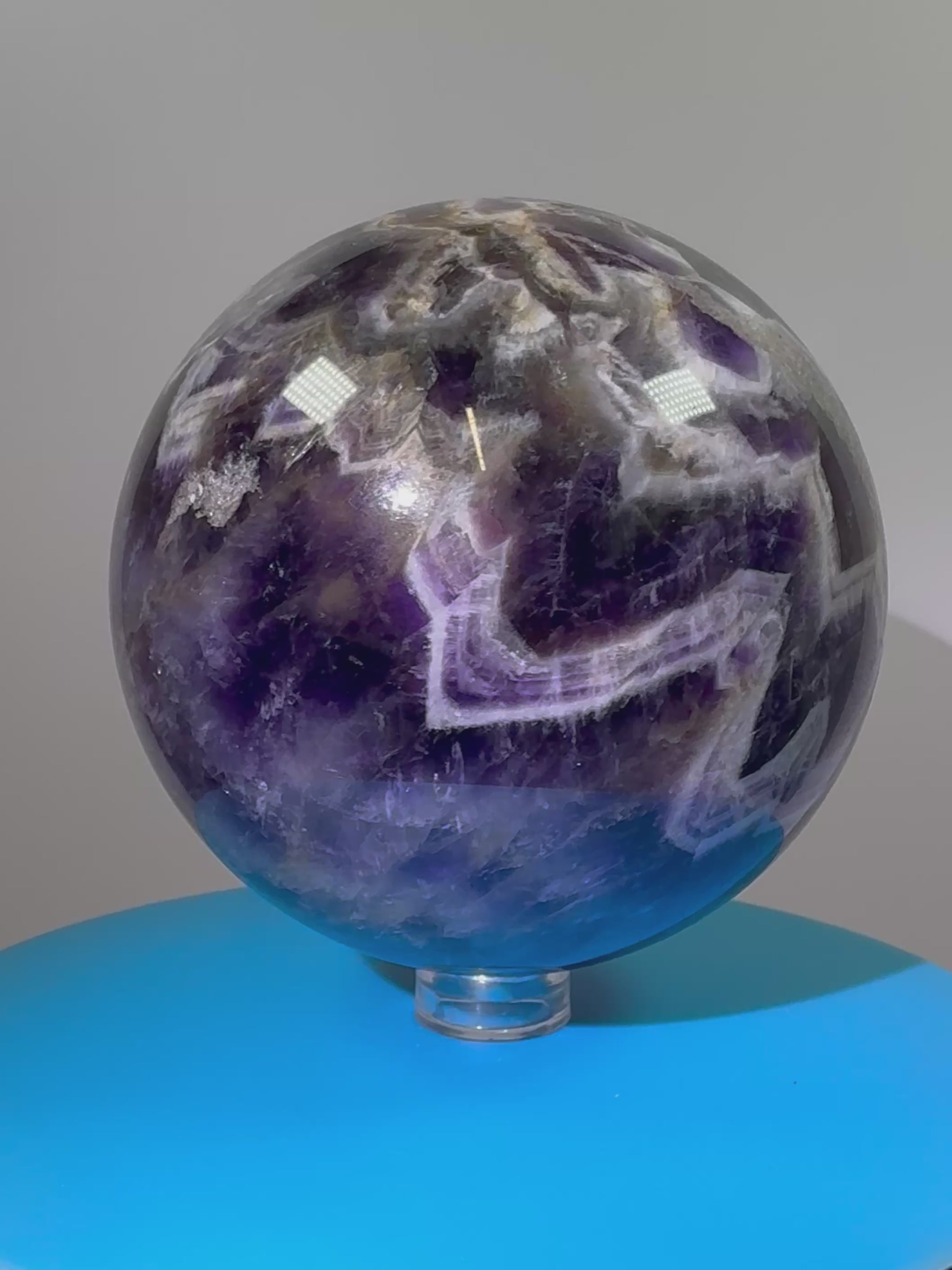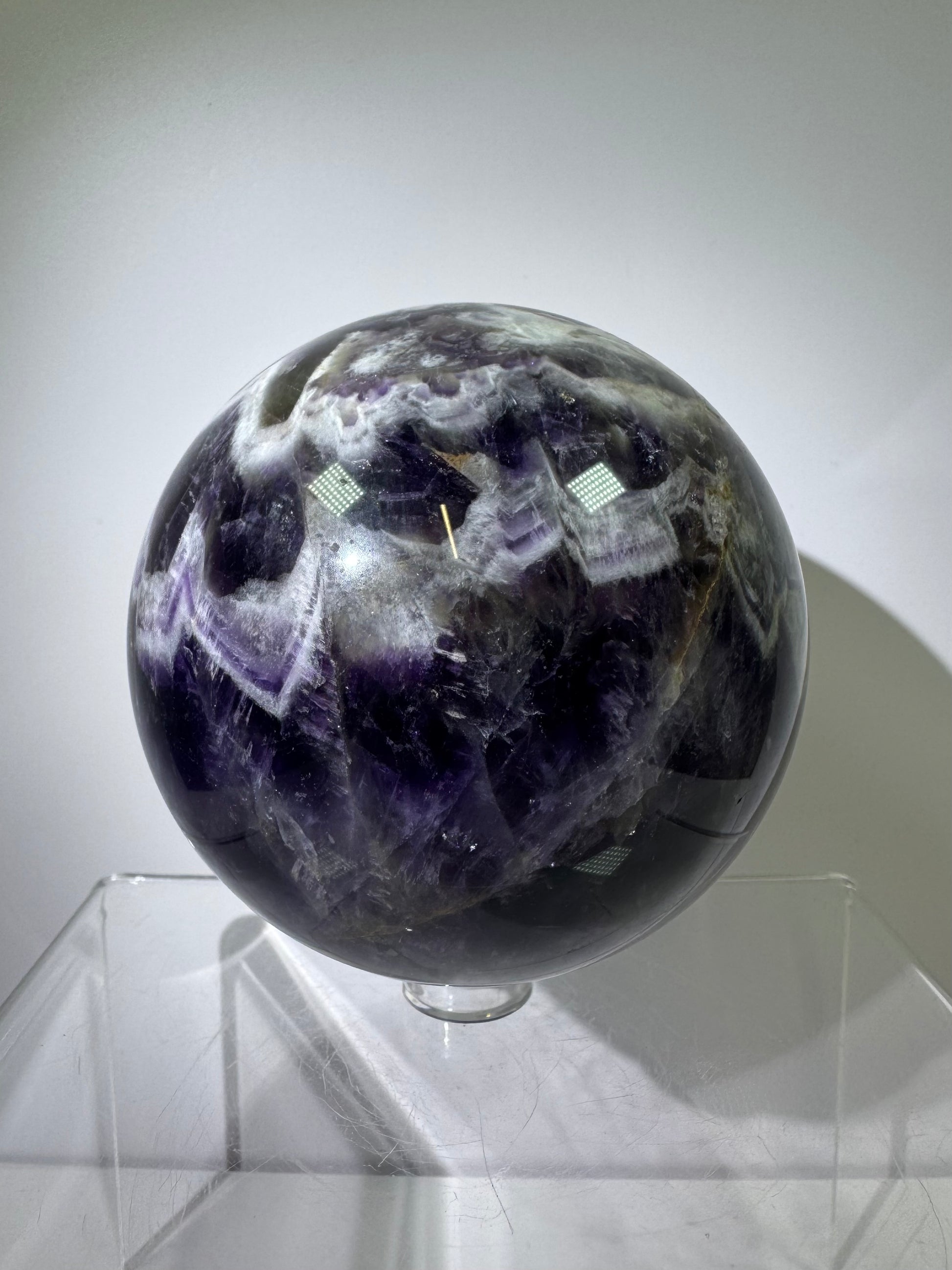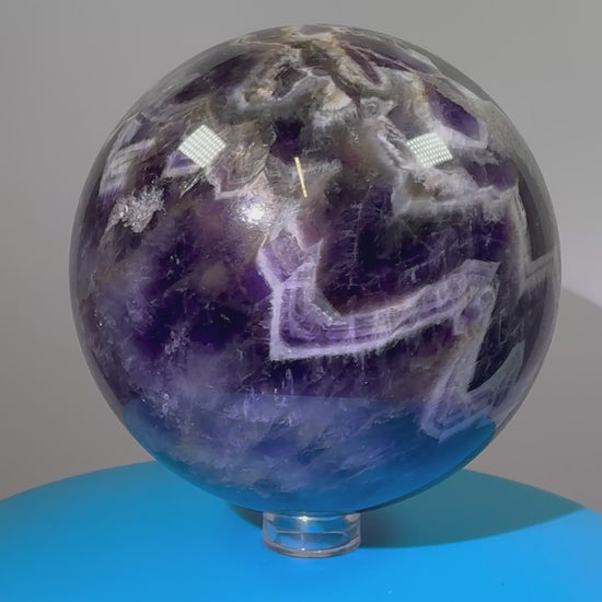 Let your imagination run wild with the Dream Amethyst Sphere. This large chevron amethyst crystal will mesmerize you with its unique patterns and vibrant colors. Perfect for meditation and dream work. Enhance your crystal collection with this stunning piece.