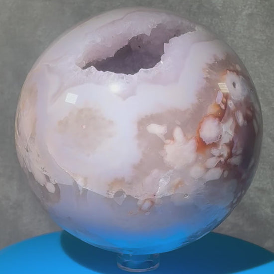 Enhance your collection with this stunning large Flower Agate Sphere from Madagascar. Measuring 90mm, its natural druzy formation is truly amazing. Perfect for display, this one-of-a-kind sphere adds a touch of beauty and uniqueness to any space.
