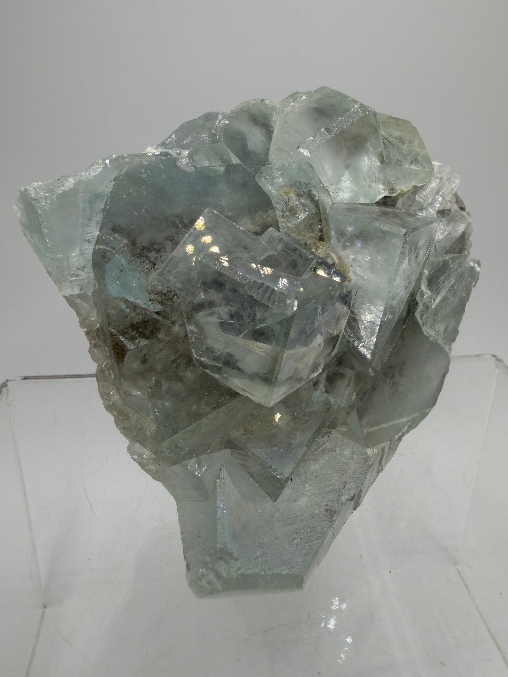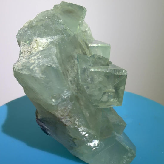 This exquisite specimen of Fluorite cubes from Xianghualing China boasts a beautiful light green color, adorned with shimmering iridescent rainbows and unique garden inclusions. This rare crystal is a must-have for any collector, and its beauty makes it a perfect display piece for any space.