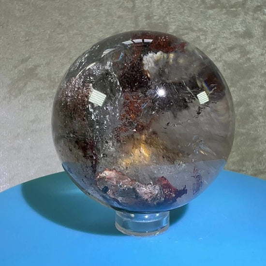 Gorgeous high quality garden quartz, this stunning lodolite sphere boasts a mesmerizing orange and green landscape. With its clear, intricate details, it's the perfect addition to any crystal collection. Bring the beauty of nature into your home with this one-of-a-kind piece.