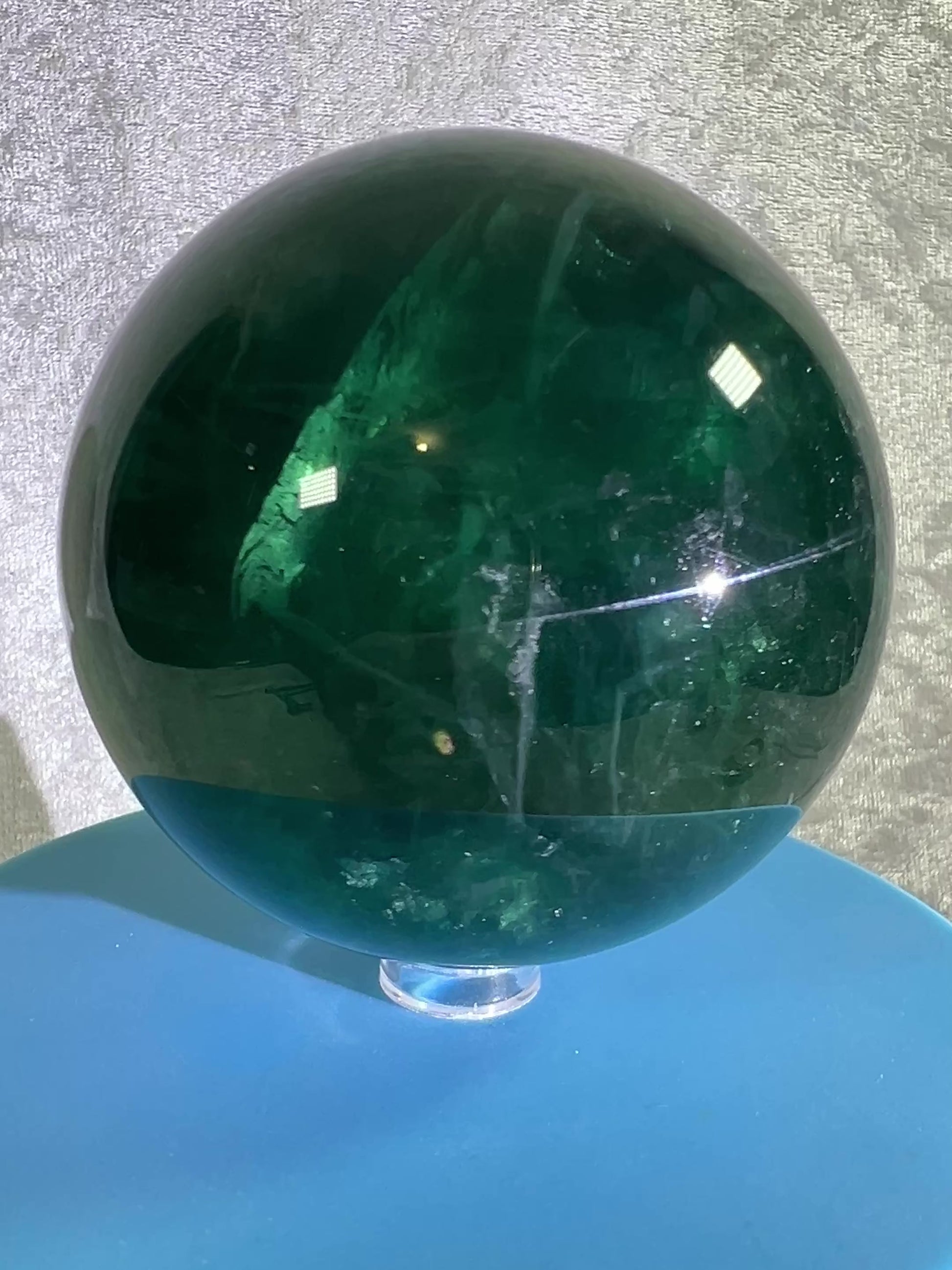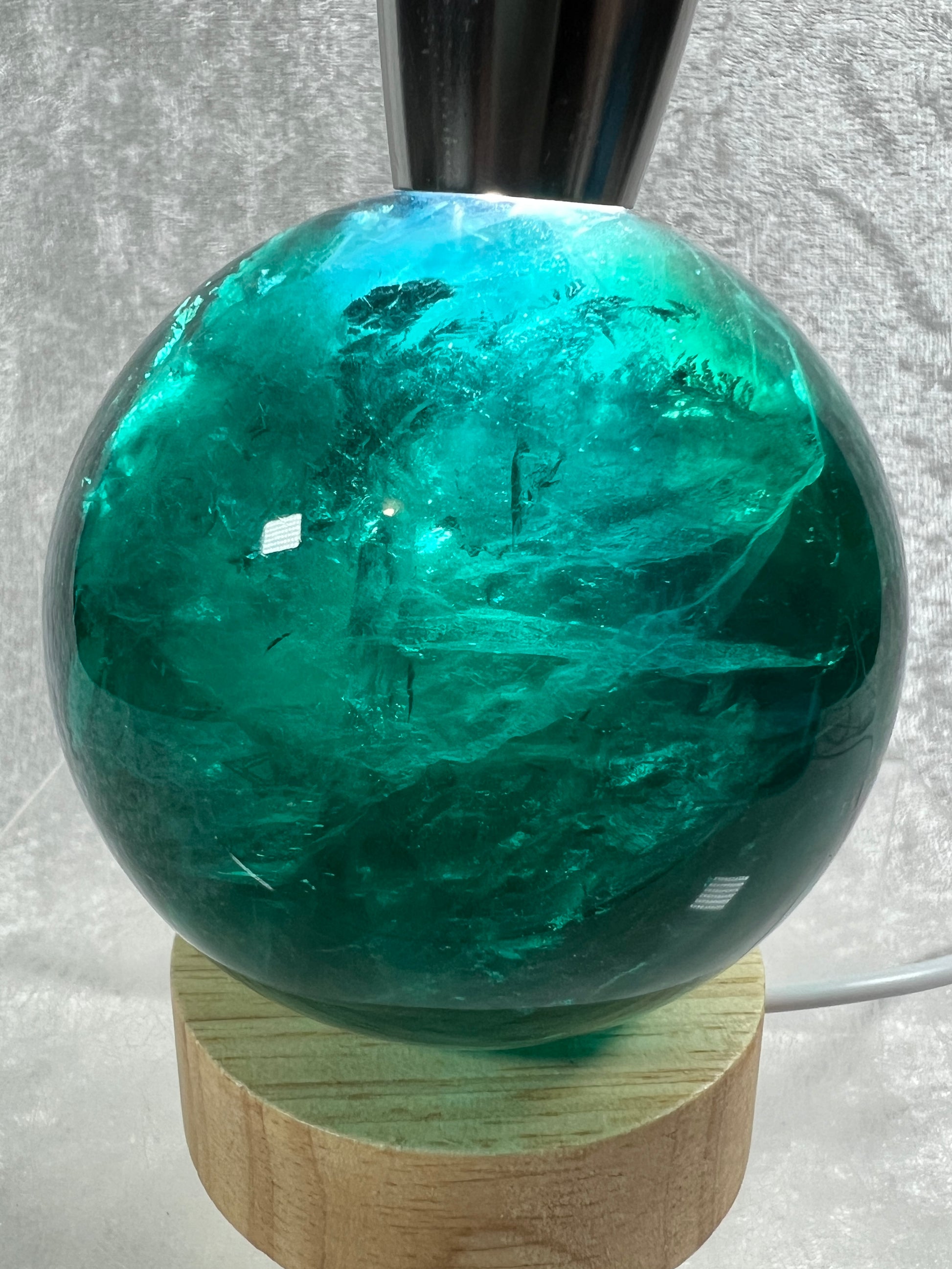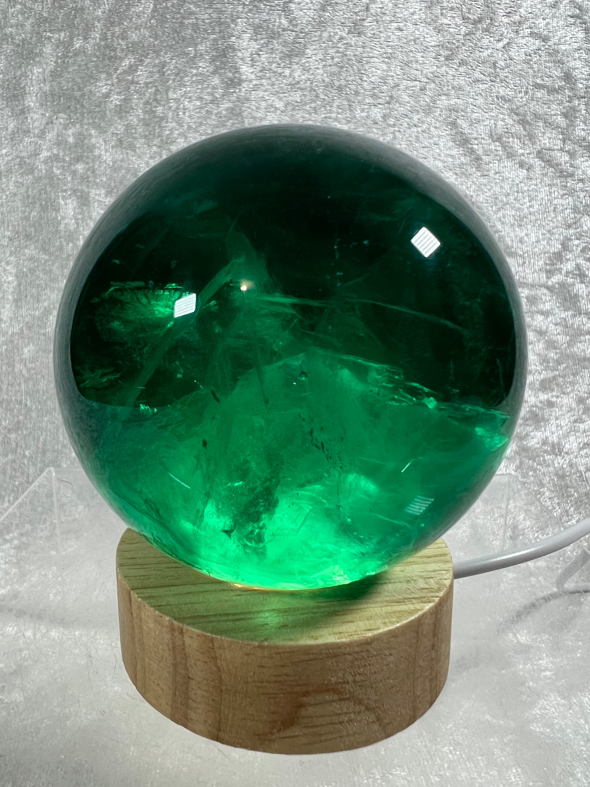 Green Fluorite Sphere. 76mm. Rare Emerald Green Fluorite. Comes With A White Light Stand. Gorgeous High Quality Crystal