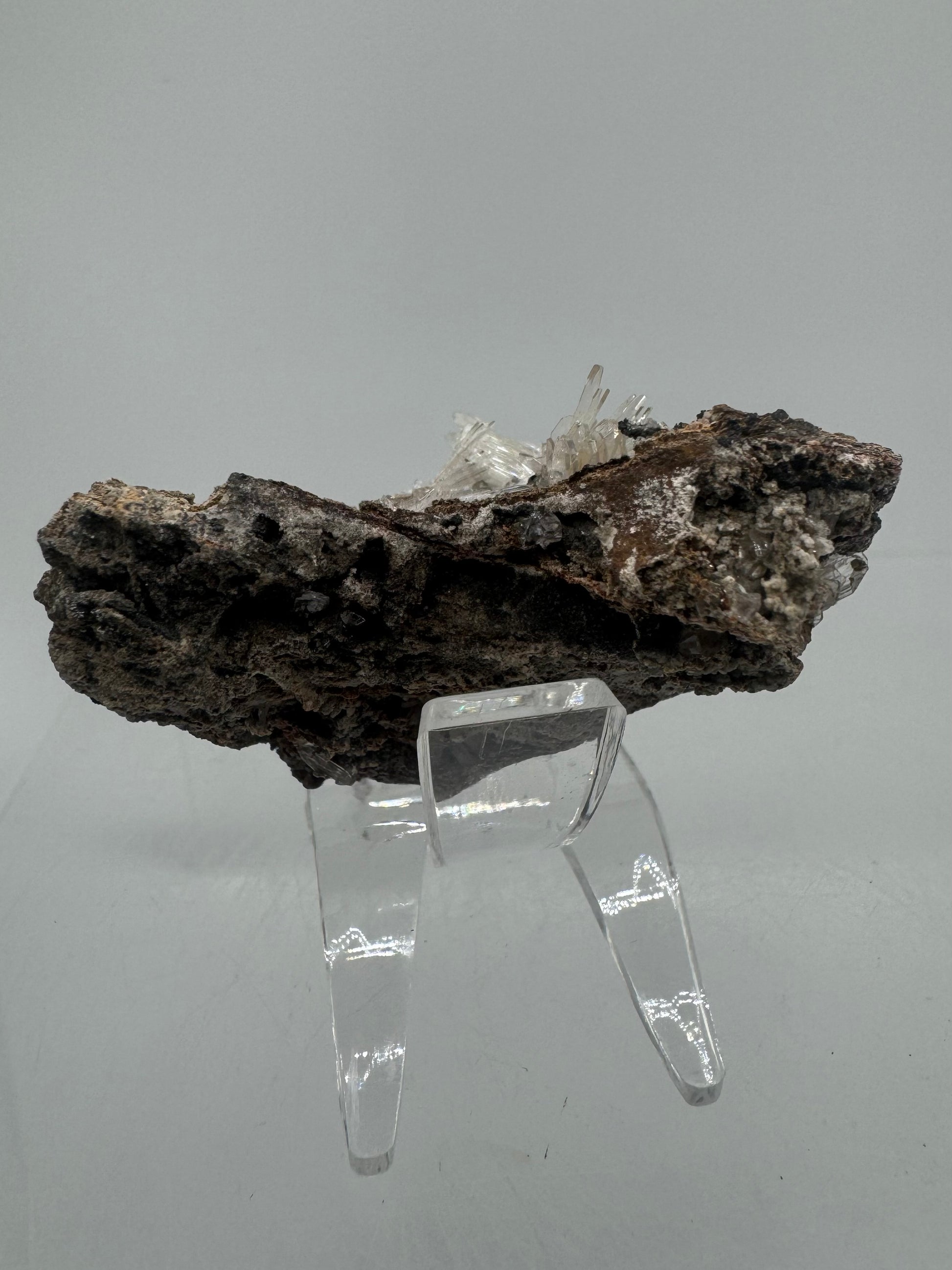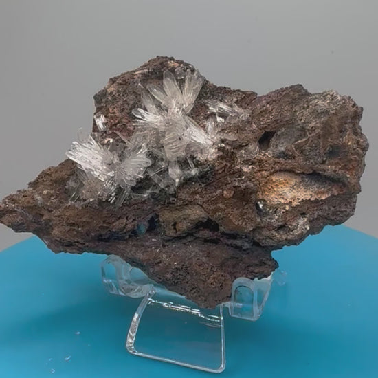 This stunning mineral specimen features rare Hemimorphite and Hematite crystals from the Ojuela mine in Mapimi, Durango, Mexico. Its clear crystal flowers create a gorgeous contrast in color, making it a unique addition to any collection. Own a piece of natural beauty today. Clear small display stand is included.