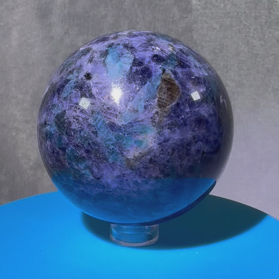 This stunning, 62mm Iolite Crystal Sphere is a rare and beautiful display piece that is sure to impress. Sourced from Madagascar, this water sapphire is a unique form of Cordierite, known for its striking blue-violet color. With its mesmerizing appearance and rare composition, this crystal sphere is a must-have for any crystal collection.