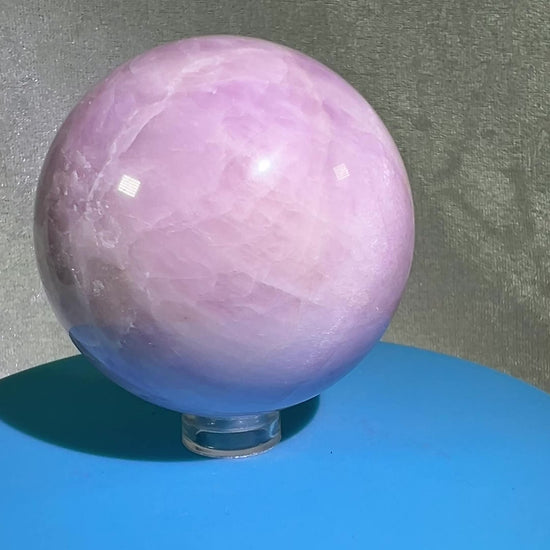 Experience the beauty and rarity of this Kunzite Crystal Sphere. Its stunning lavender hues and excellent flash make it a unique display piece. This rare sphere is a must-have for any crystal collection.