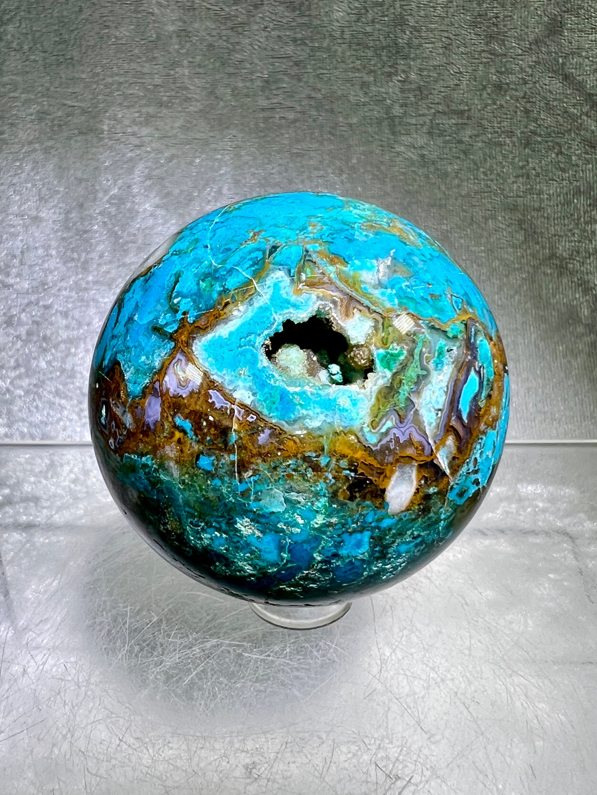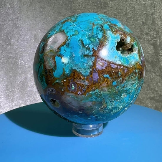This Chrysocolla Druzy Sphere from Peru is a rare and beautiful addition to any collection. With vibrant colors and amazing patterns, this sphere is a true gem. The gorgeous druzy surface also features rare laces of purple, making it a unique and eye-catching piece. Don't miss out on this gorgeous and one-of-a-kind find!