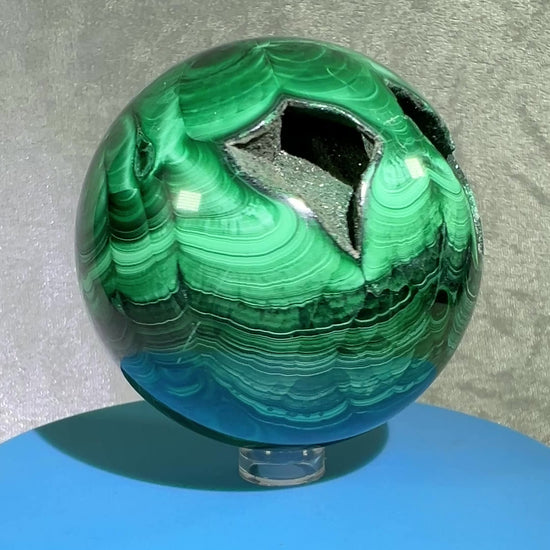 Indulge in the beauty of nature with our stunning Malachite Crystal Sphere. This large collector's piece is very high quality and boasts amazing druzy formations. Own a luxurious and unique display sphere unlike any other. A must-have for any collector!