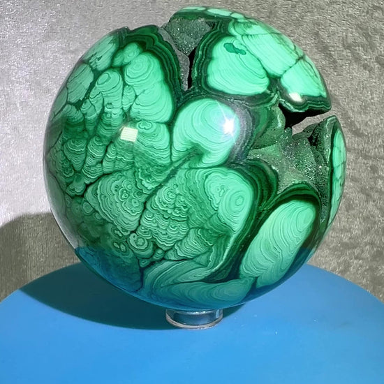 Indulge in the beauty of nature with our stunning Malachite Crystal Sphere. This large collector's piece is very high quality and boasts amazing druzy formations. Own a luxurious and unique display sphere unlike any other. A must-have for any collector!