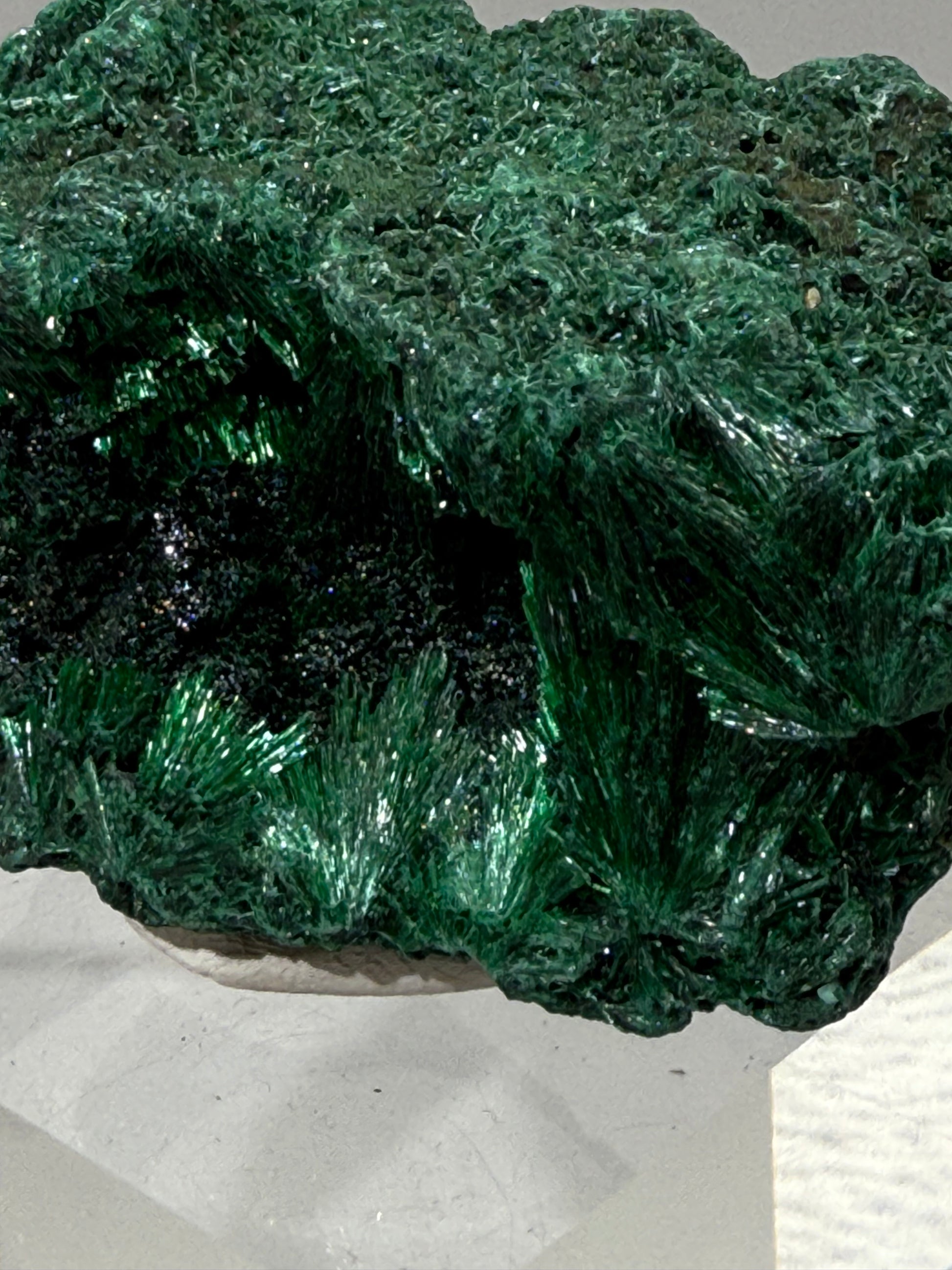 This silky malachite is a beautiful specimen from Kasompe, Congo. This region is world famous for producing the finest collector specimens. Add a touch of elegance and beauty to your home or office with this unique specimen.