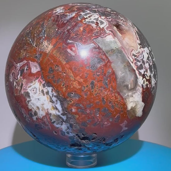 Indulge in luxury with our stunning Mexican Crazy Lace Agate Sphere. Measuring 78mm, this rare find boasts deep, rich colors and amazing patterns that will leave you in awe. Perfect for display, this large sphere is a must-have for any collection. Elevate your space with this exclusive treasure.