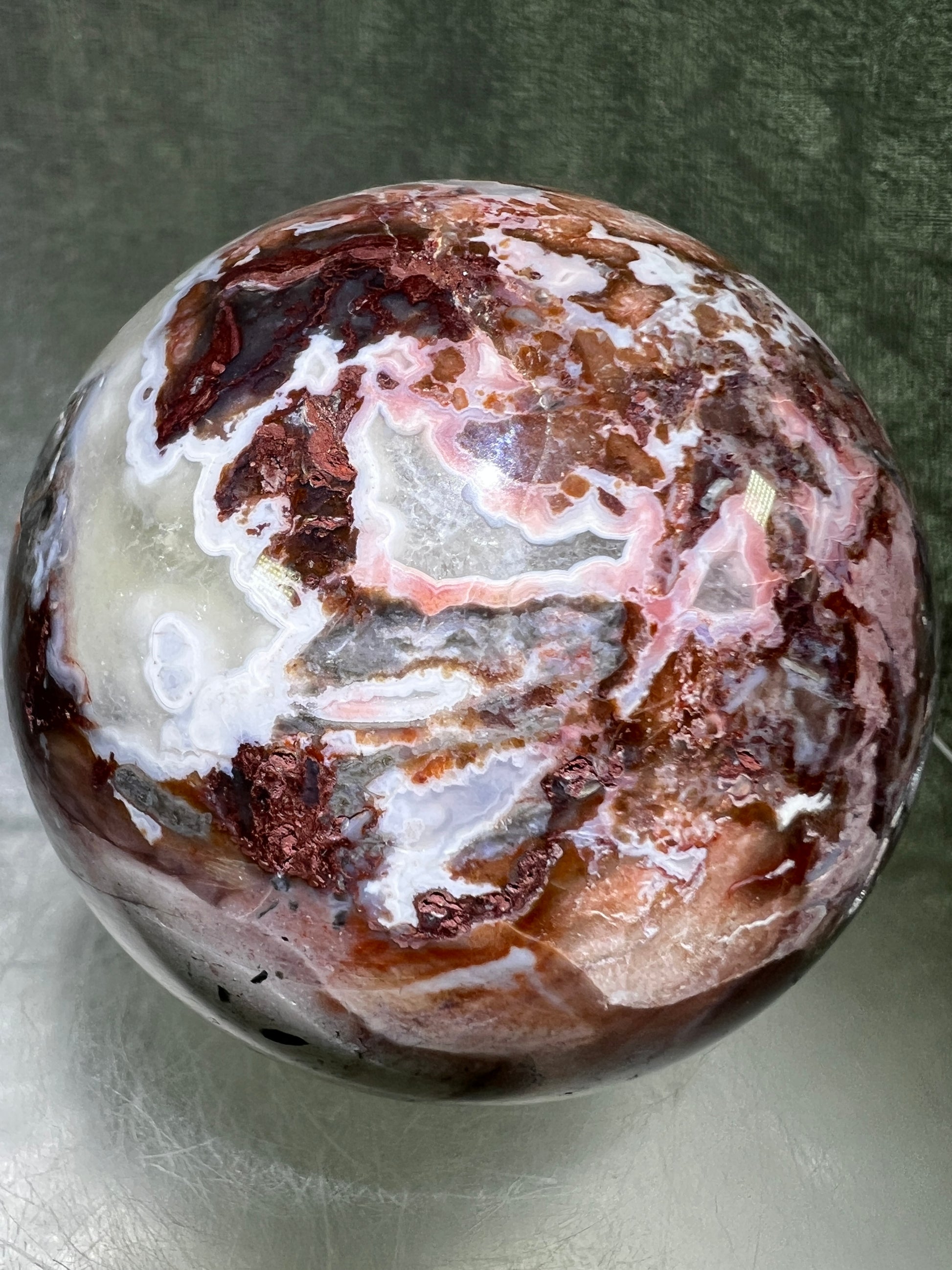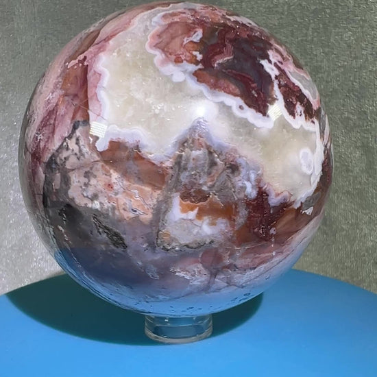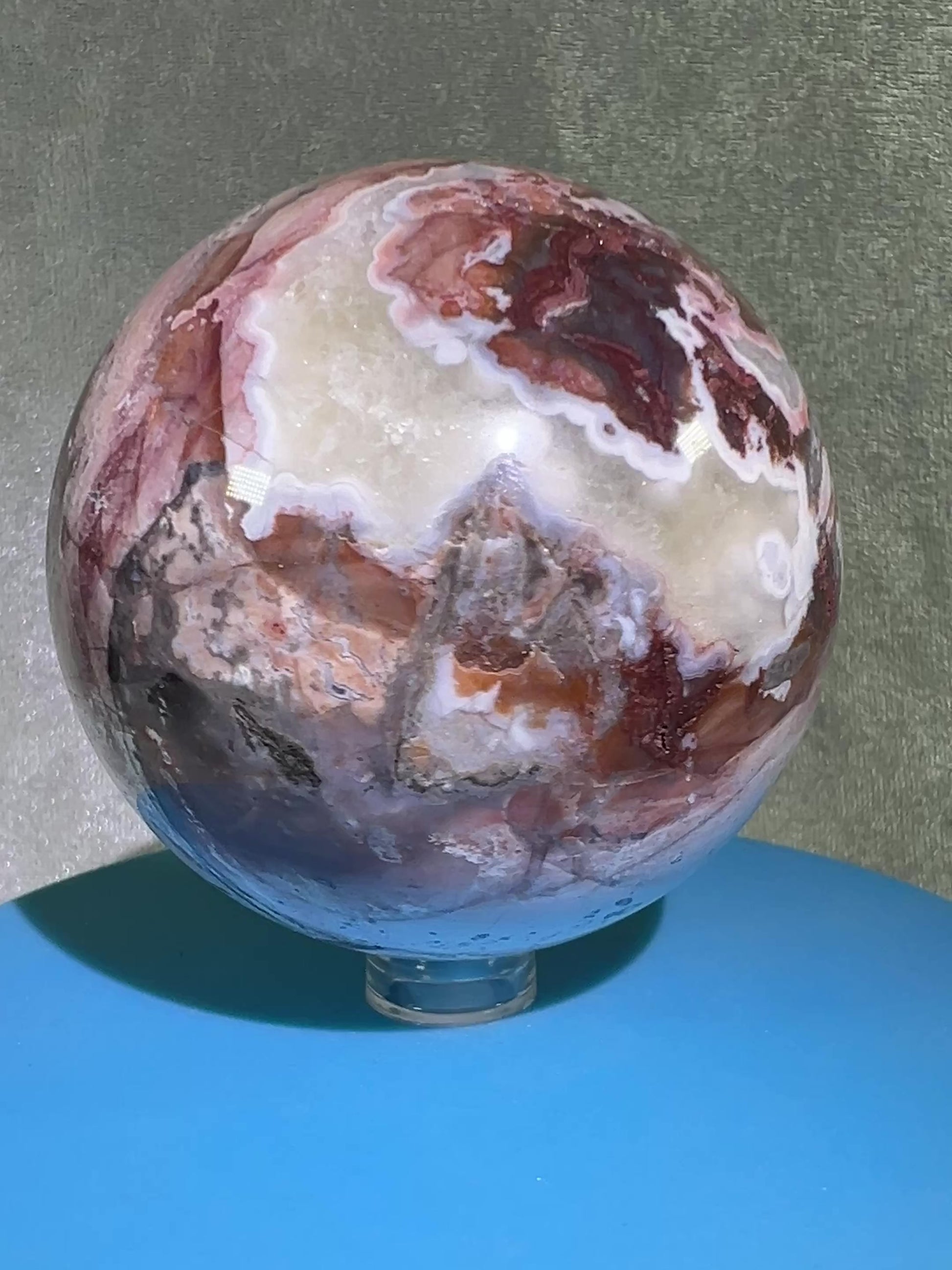 This Mexican Crazy Lace Agate Sphere features breathtaking rare pinks and gorgeous patterns. Perfect for collectors or as a statement piece, this sphere is a must-have for any crystal lover. Enhance your space with the vibrant and unique energy of this highly coveted stone.