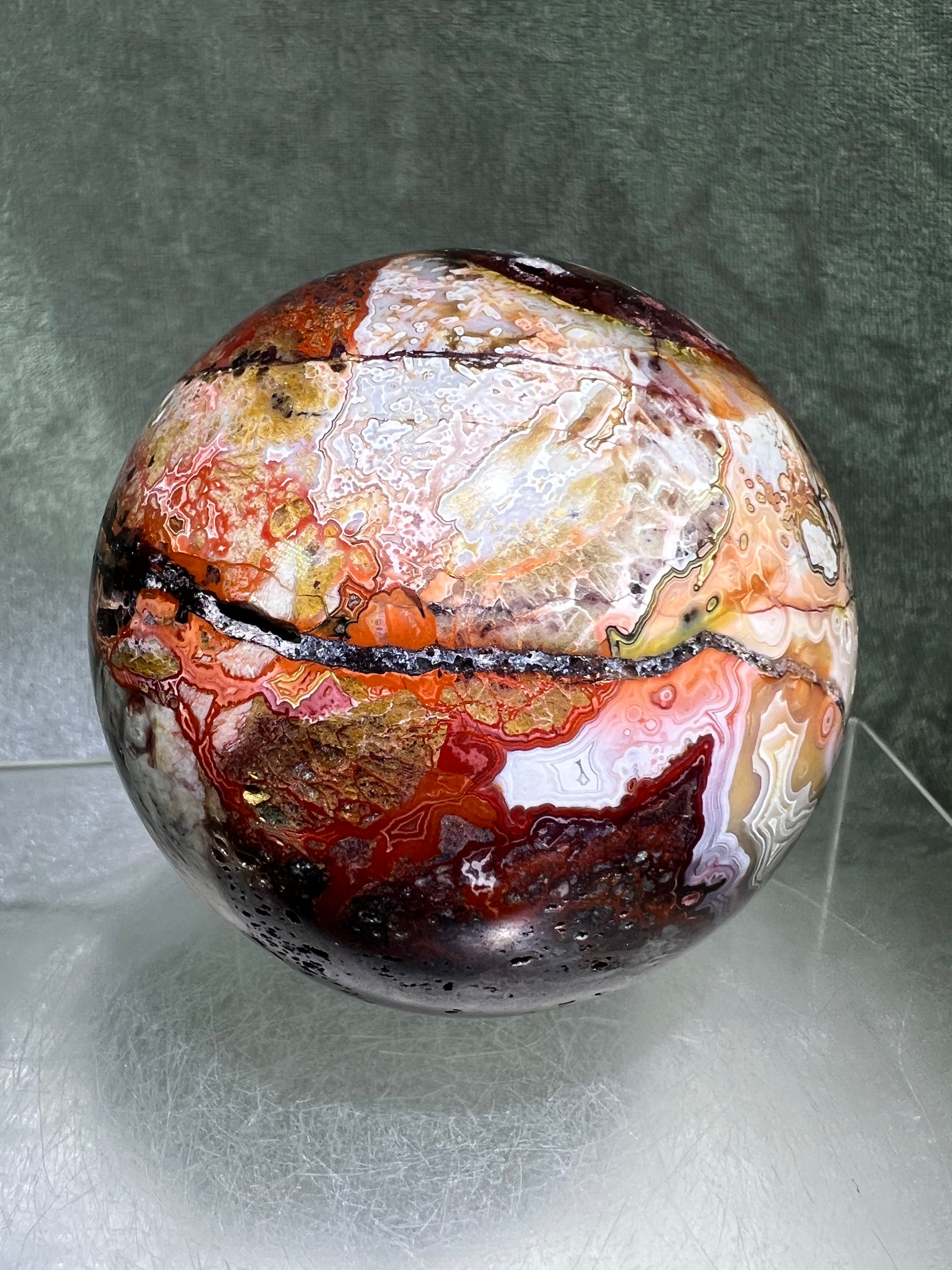 Mexican Crazy Lace Agate Sphere. 73mm. Very Rare Colors And Gorgeous Patterns.