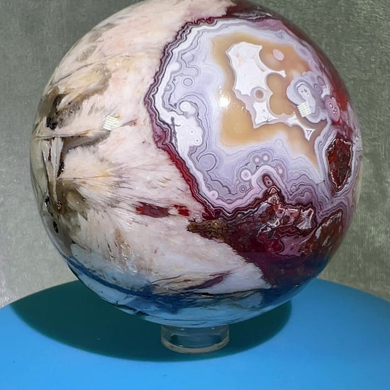 This Mexican Crazy Lace Agate Sphere features breathtaking rare purples and gorgeous lacing. Perfect for collectors or as a statement piece, this sphere is a must-have for any crystal lover. Enhance your space with the vibrant and unique energy of this highly coveted stone.