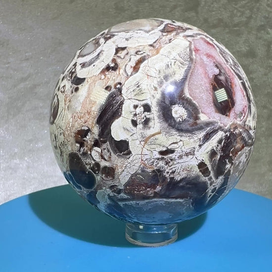This Money Agate Crystal Sphere is sourced from Indonesia's finest bloodstone. Its beautiful colors and patterns make it a stunning addition to any collection. Enhance your financial abundance and manifest prosperity with the powerful energy of this mesmerizing sphere.