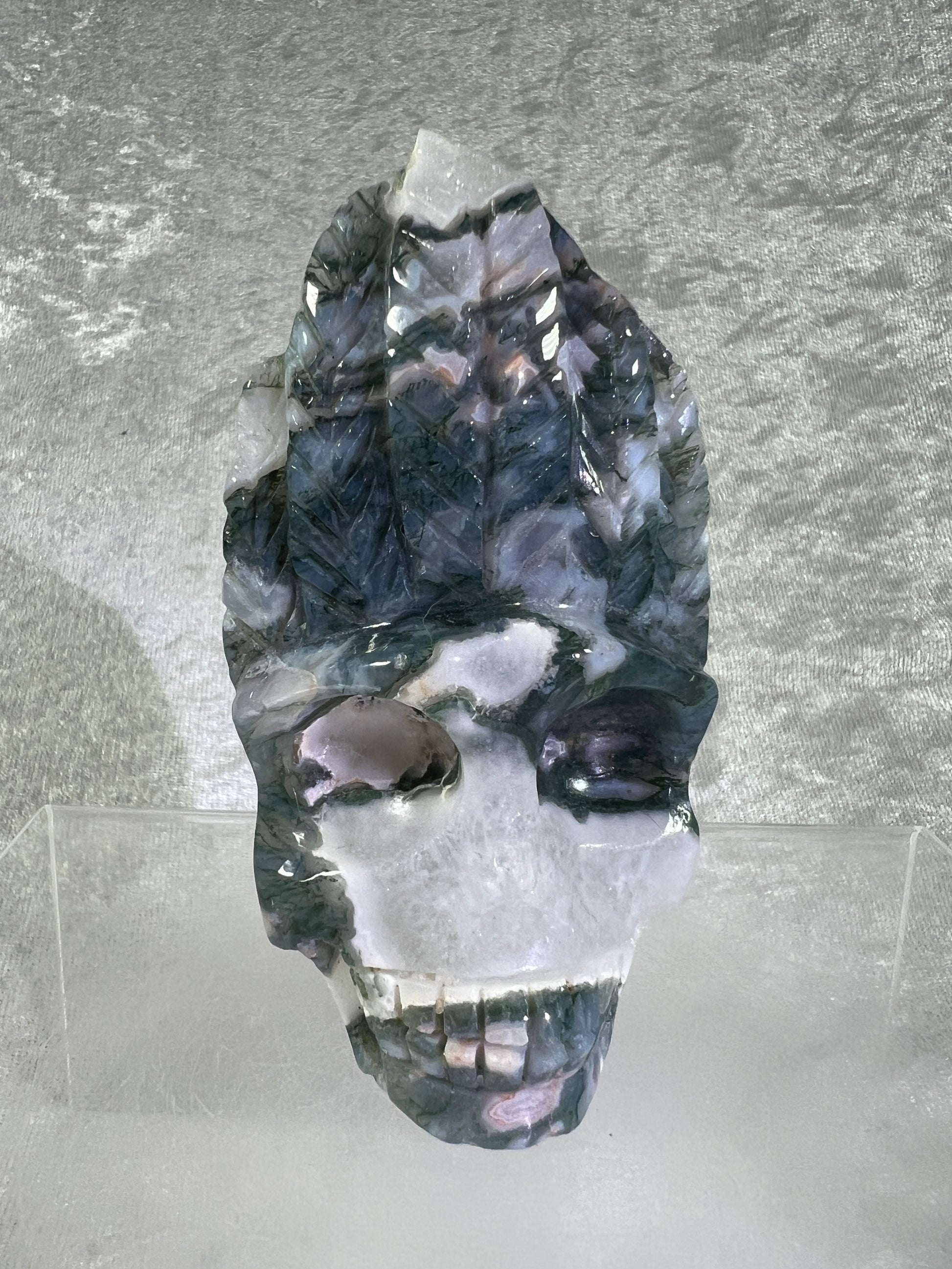 Moss Agate Crystal Skull Carving. Very Cool Crystal Indian Skull. Unique Display Crystal