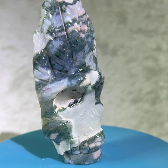 Add a unique touch to your crystal collection with our Moss Agate Crystal Skull Carving! This very cool Indian skull carving is sure to be a conversation starter. Bring a touch of quirkiness to your display with this one-of-a-kind crystal carving.