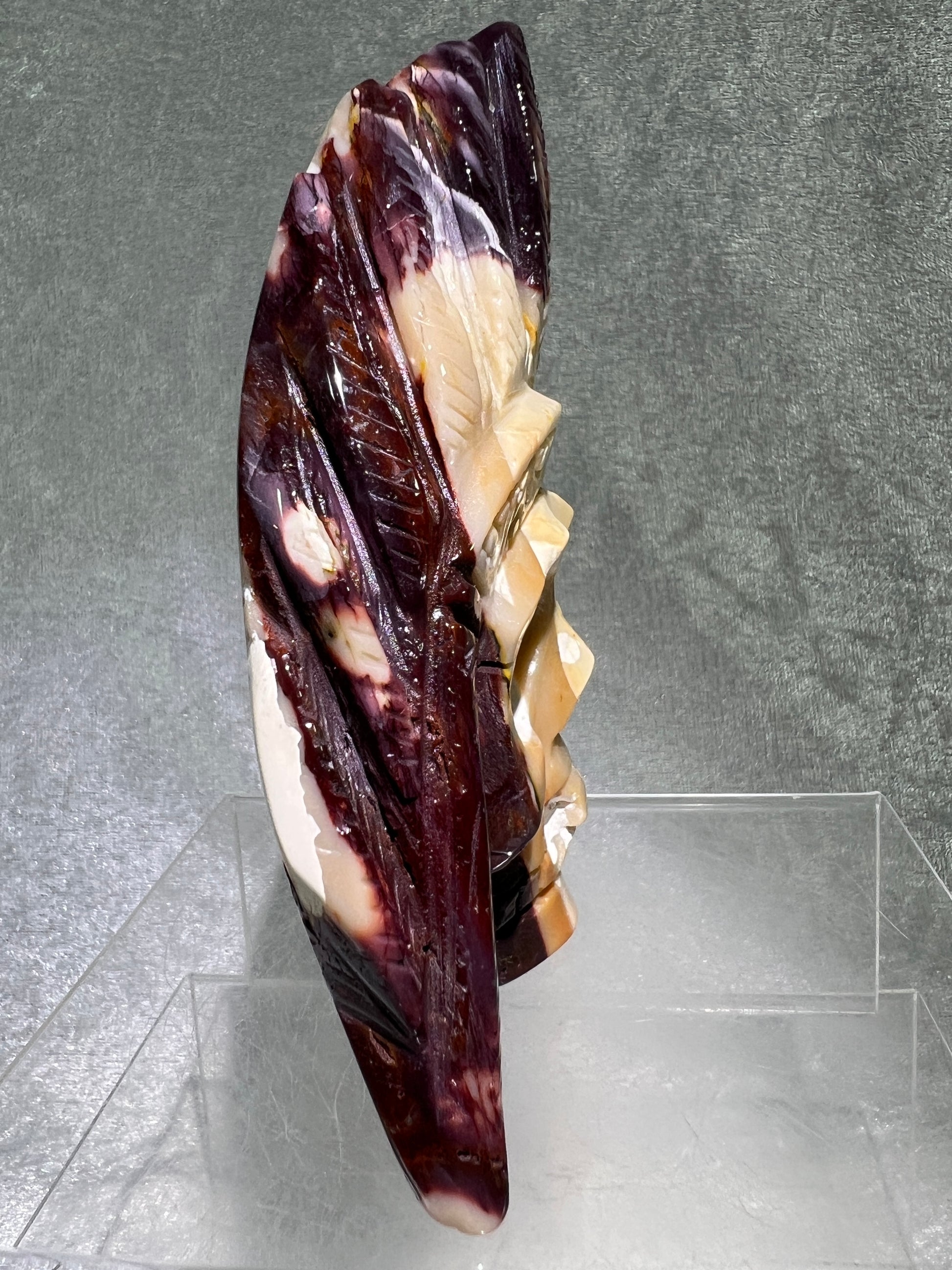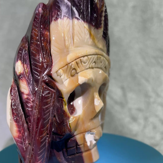 Enhance your collection with this high-quality Mookaite crystal skull carving. Natural druzy spots. Expertly crafted with intricate details, this Indian skull with a traditional headdress is an amazing piece of art. The unique properties of Mookaite crystal make this a valuable addition to any crystal collection.