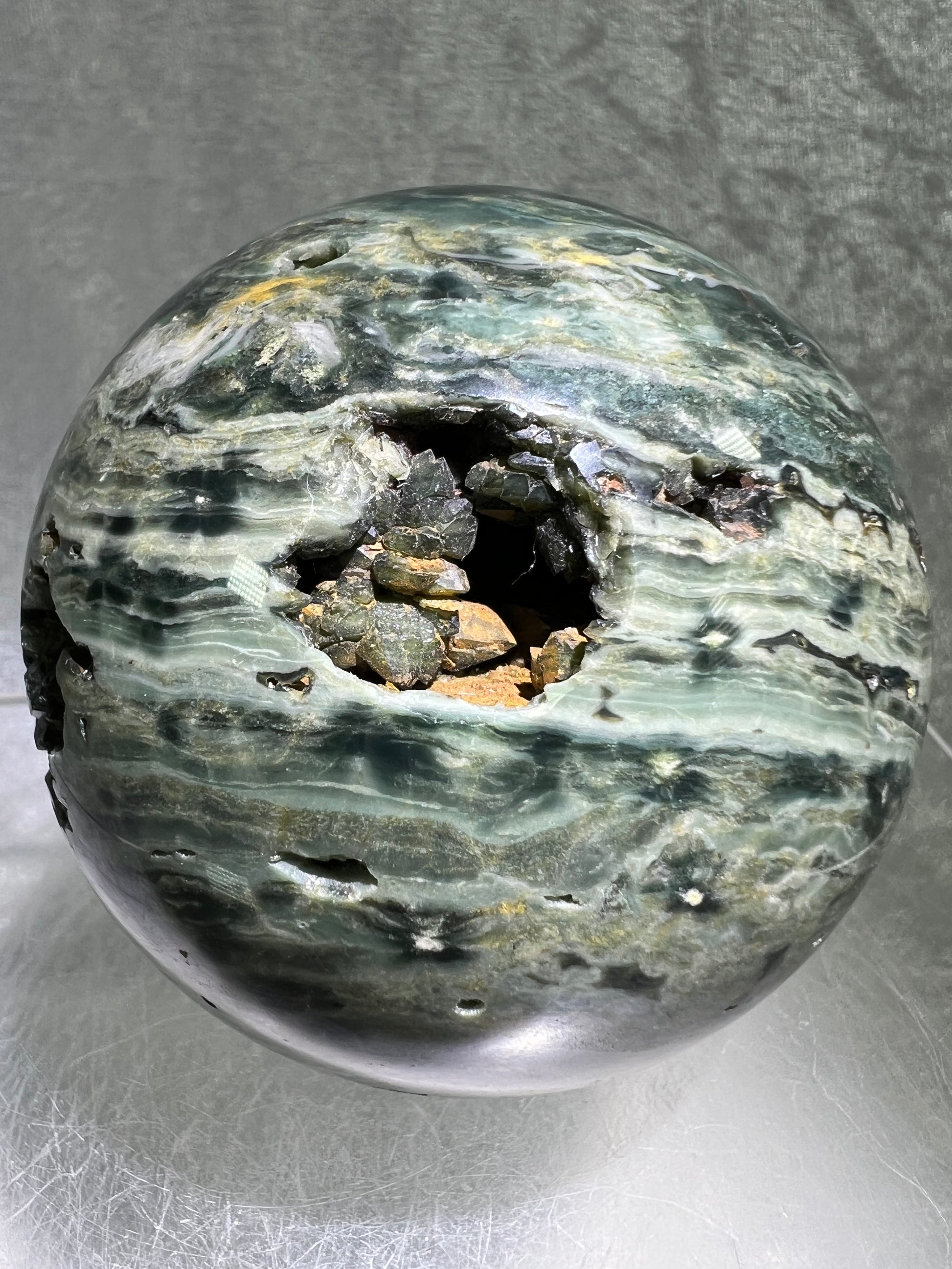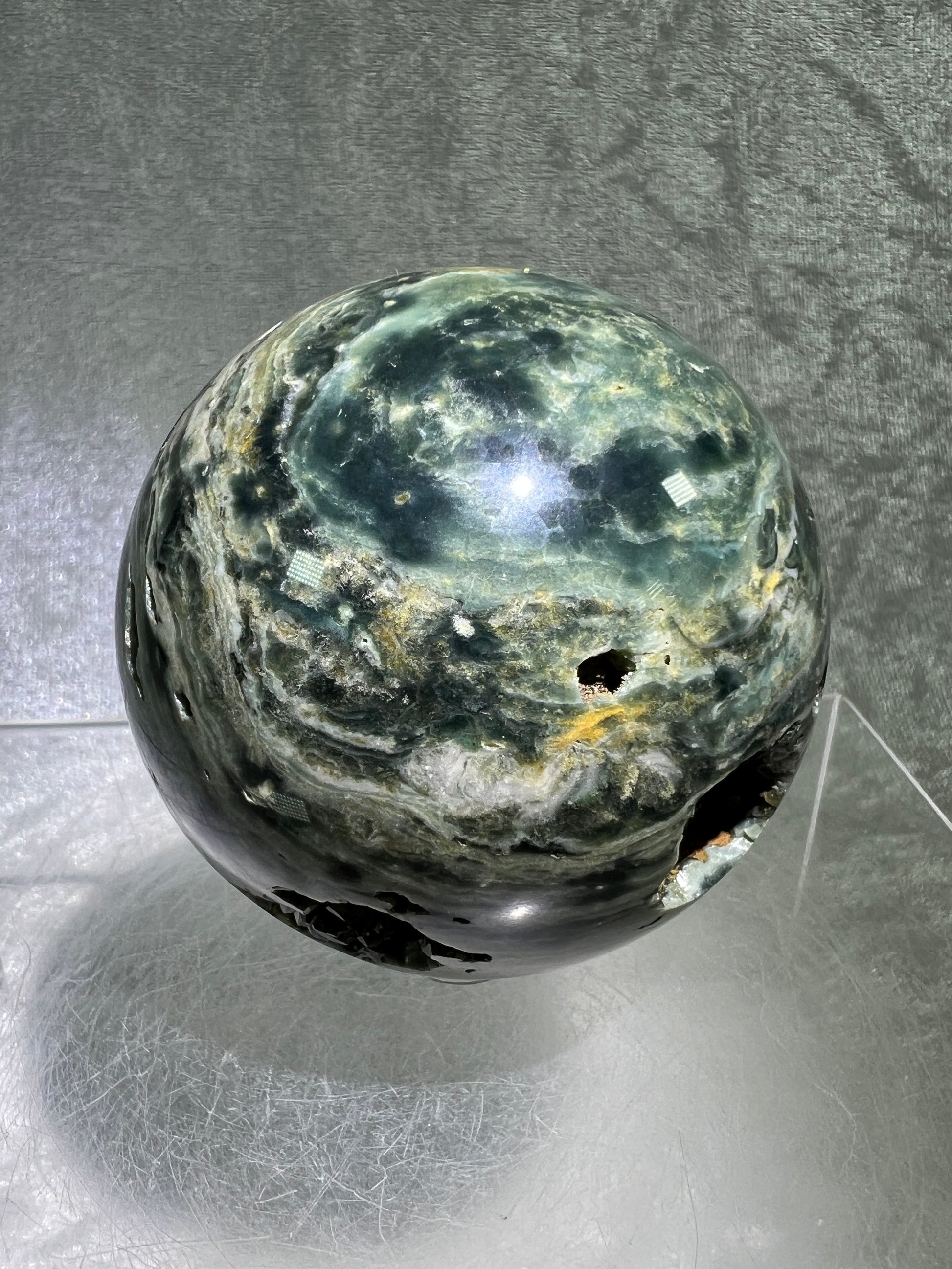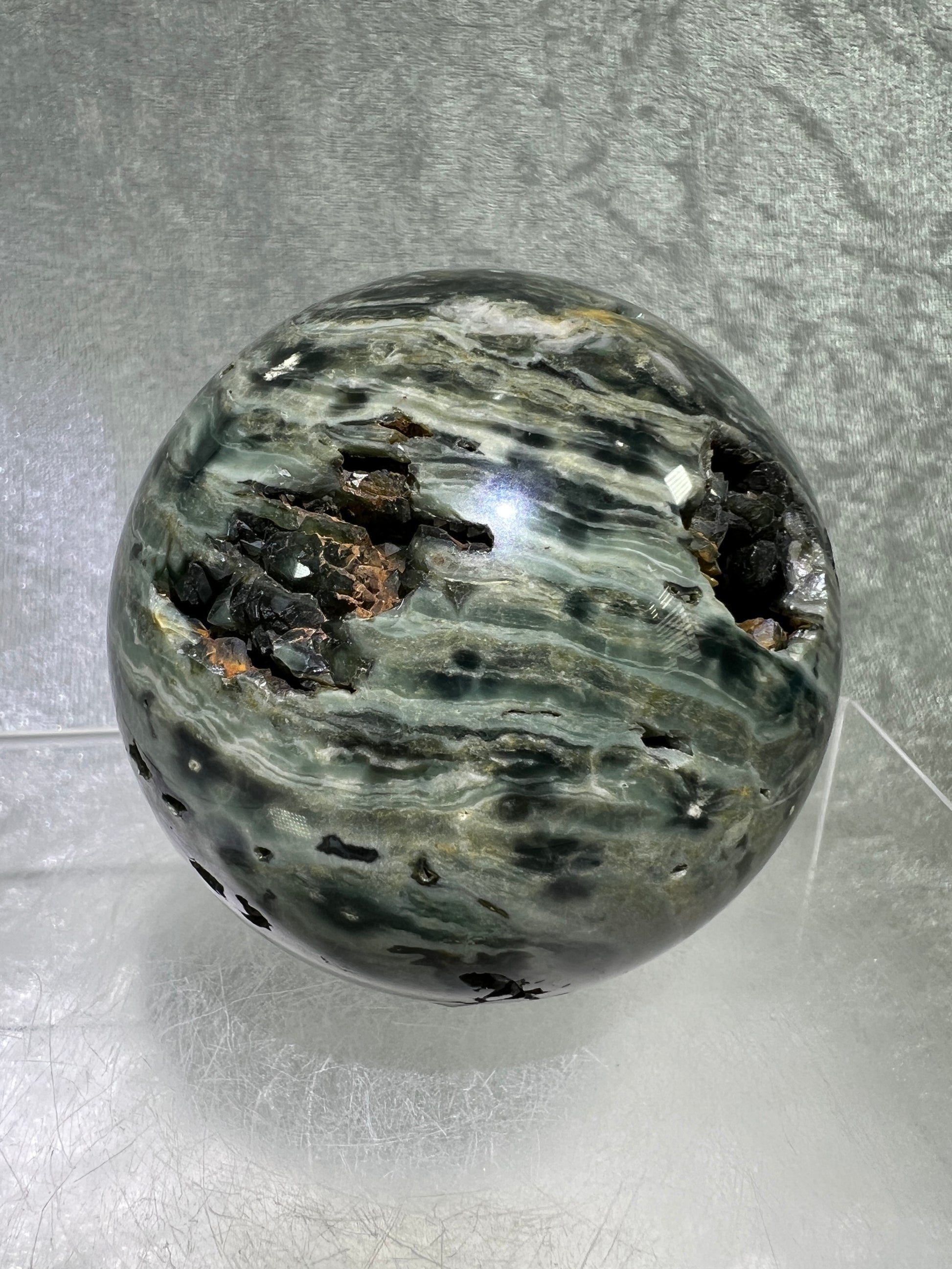 Ocean Jasper Sphere. 69mm. Very Cool Green Druzy. Stunning And Unique Display Sphere.