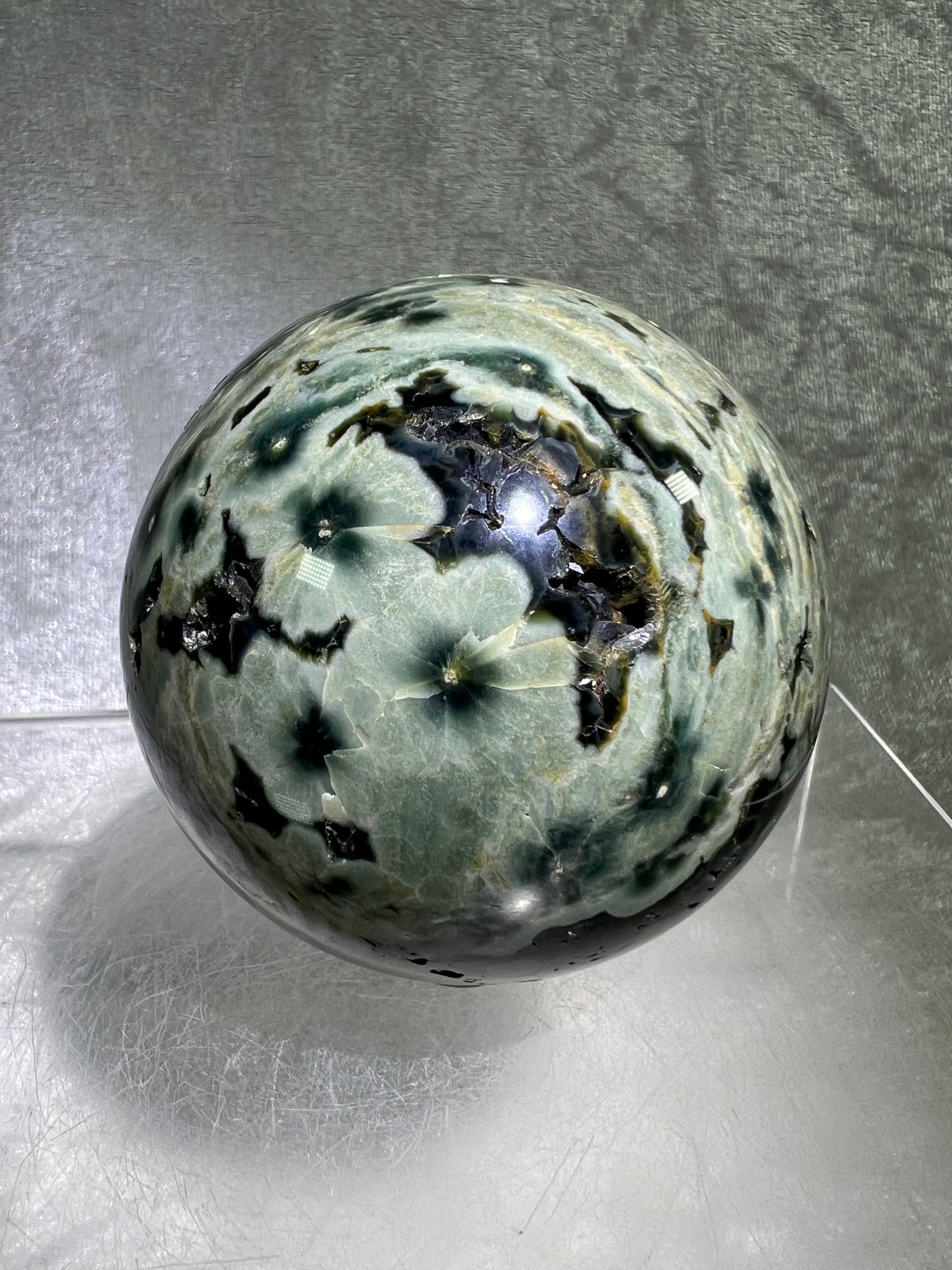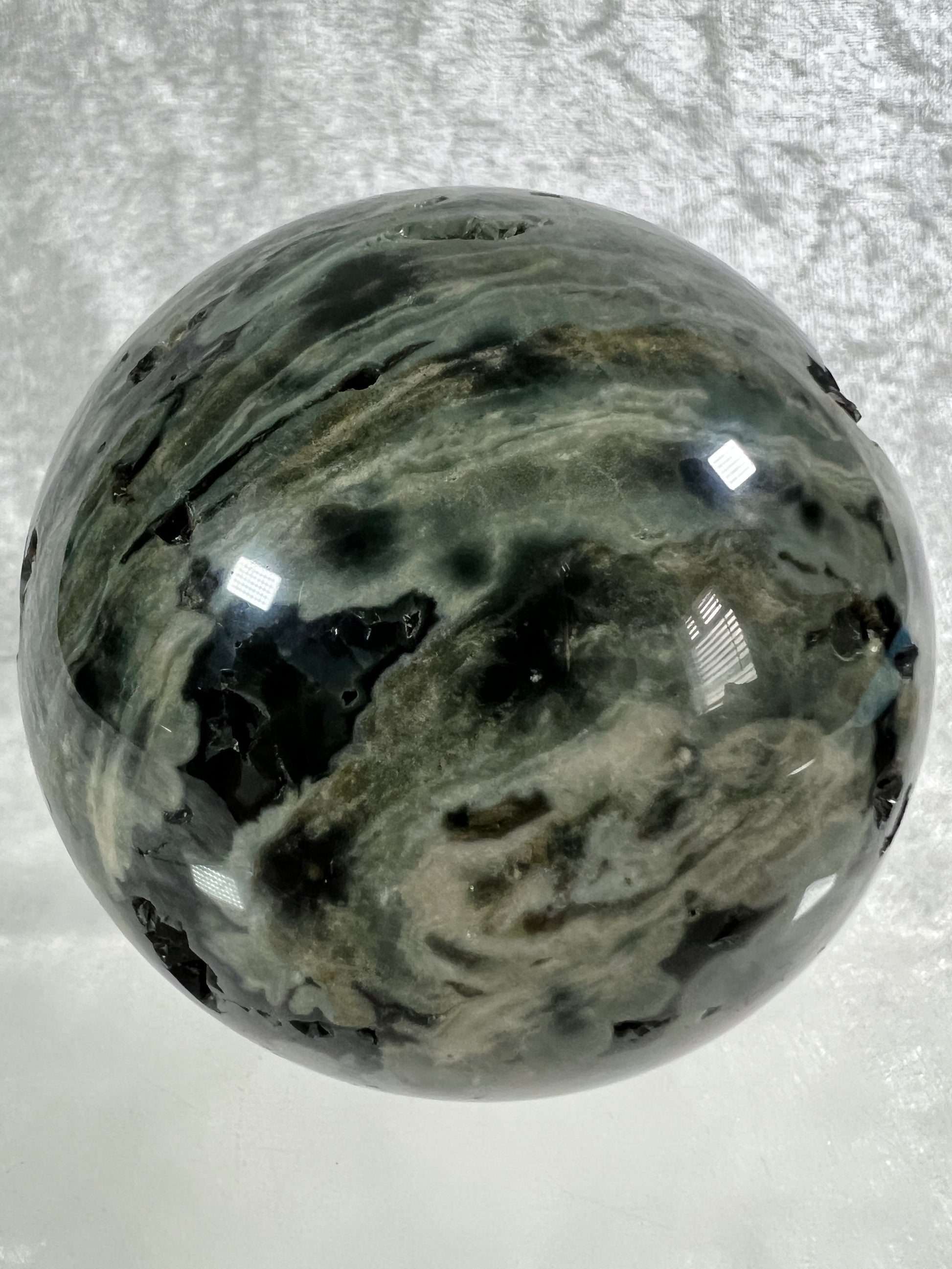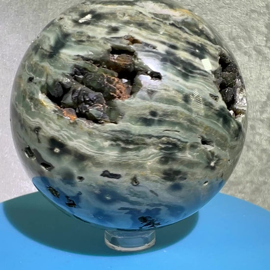 Ocean Jasper Sphere. 69mm. Very Cool Green Druzy. Stunning And Unique Display Sphere.