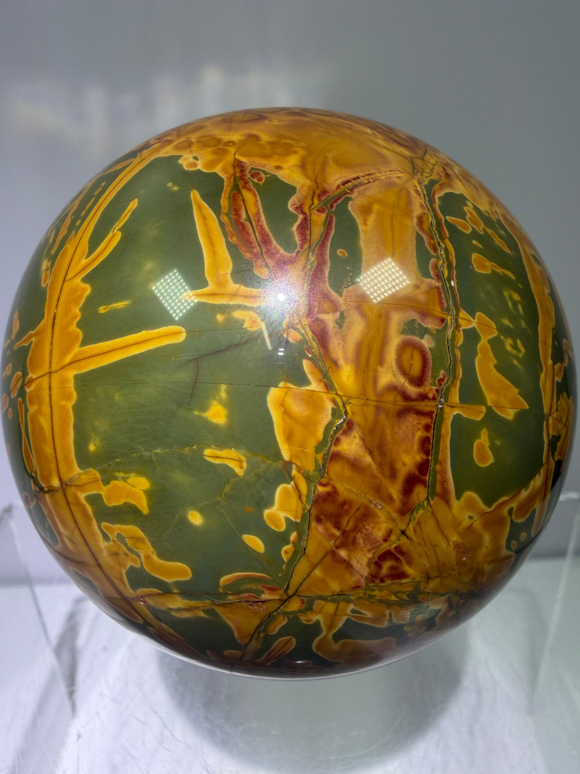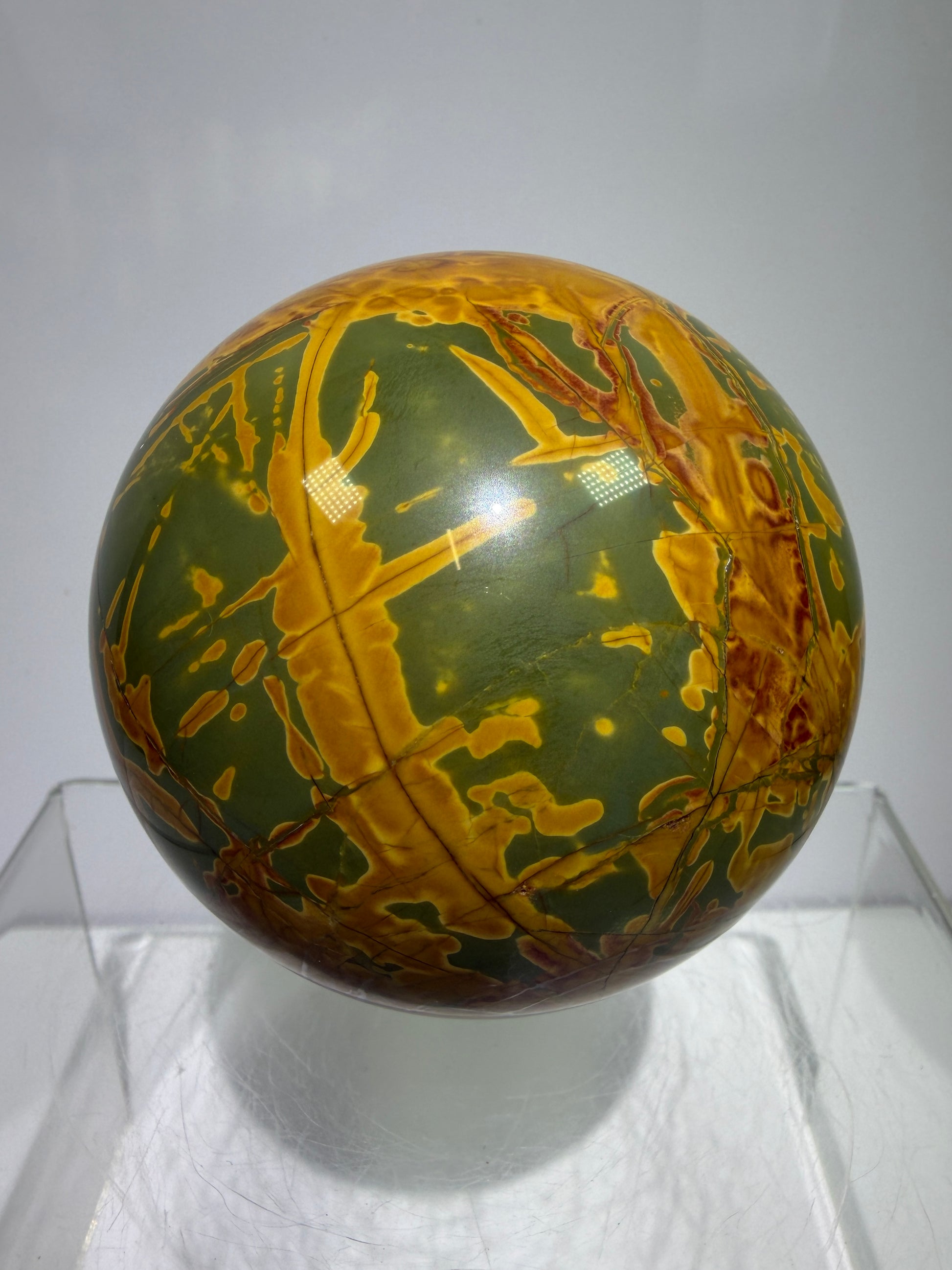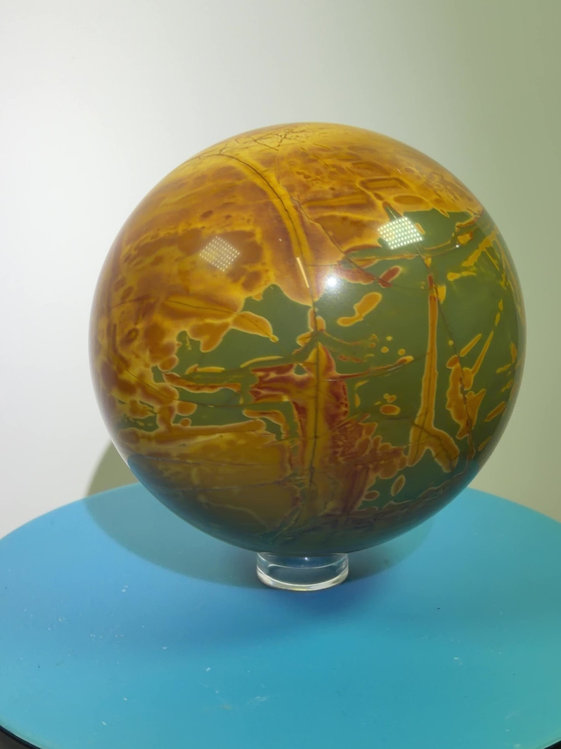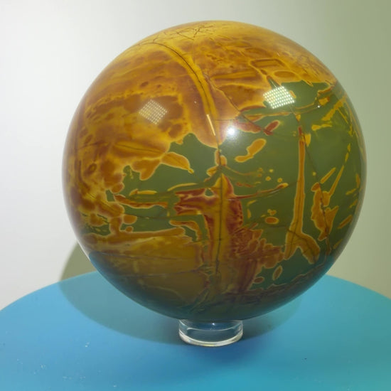 Cherry Creek Jasper, also called Red Creek Jasper is a vibrant, multi-colored semiprecious stone discovered in China. It is highly desired for its unique and colorful patterns resembling abstract art. It features earthy reds, golds, greens, and yellows from iron-rich veins in dolomite. Mined in the Yunnan Province Cherry Creek area, near the Red River. It is very sought after for jewelry due to its stunning visuals and is believed to offer grounding, protective, and balancing properties, bringing calm and relaxation. Don’t miss out on this one of a kind collector sphere.