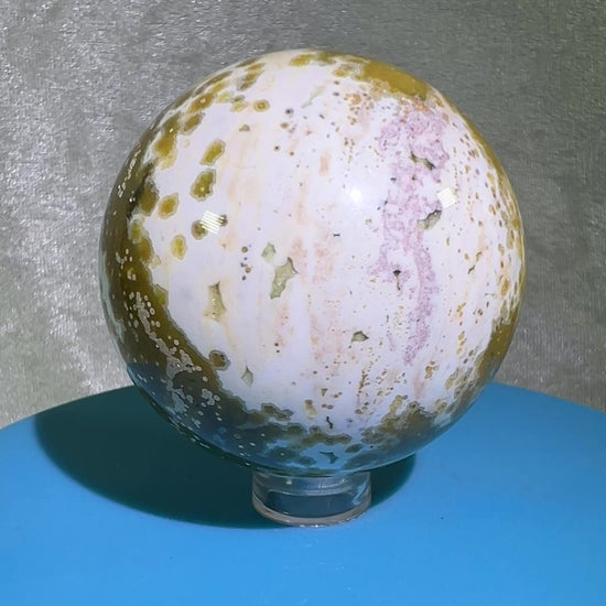 This Ocean Jasper Sphere from Madagascar is a stunning display crystal with rare and gorgeous colors. This high-quality crystal is perfect for any crystal enthusiast looking for a one-of-a-kind piece to add to their collection.