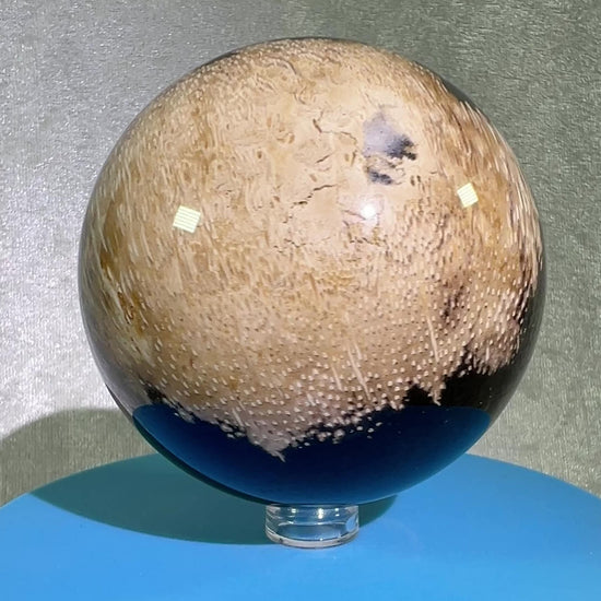 Add a touch of unique and playful energy to any space with our Palm Root Agate sphere. Crafted from fossilized black palm root, this crystal sphere is truly one-of-a-kind. A quirky addition to any crystal collection.
