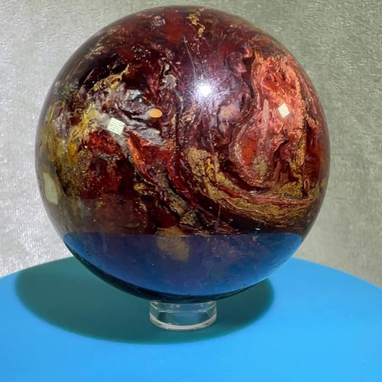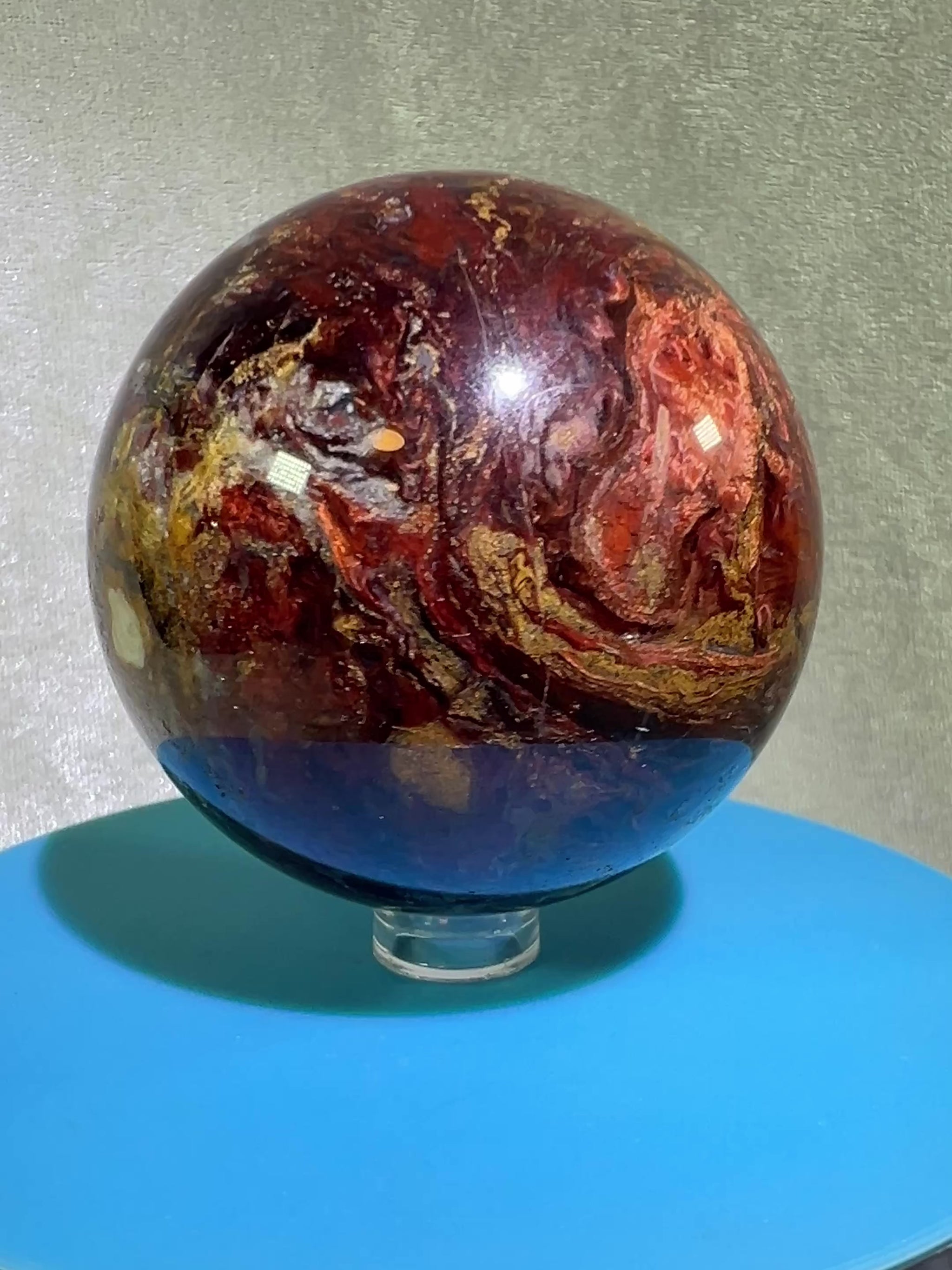 This red pietersite sphere features amazing patterns and is highly sought after for its rarity and value. Quantities are limited, making it a valuable addition to any collection. Pietersite is only found in two places in the world. Namibia, which has a very limited production. And China had two producing mines, but they are both closed down. Experience the unique beauty and intrigue of this rare gemstone firsthand.