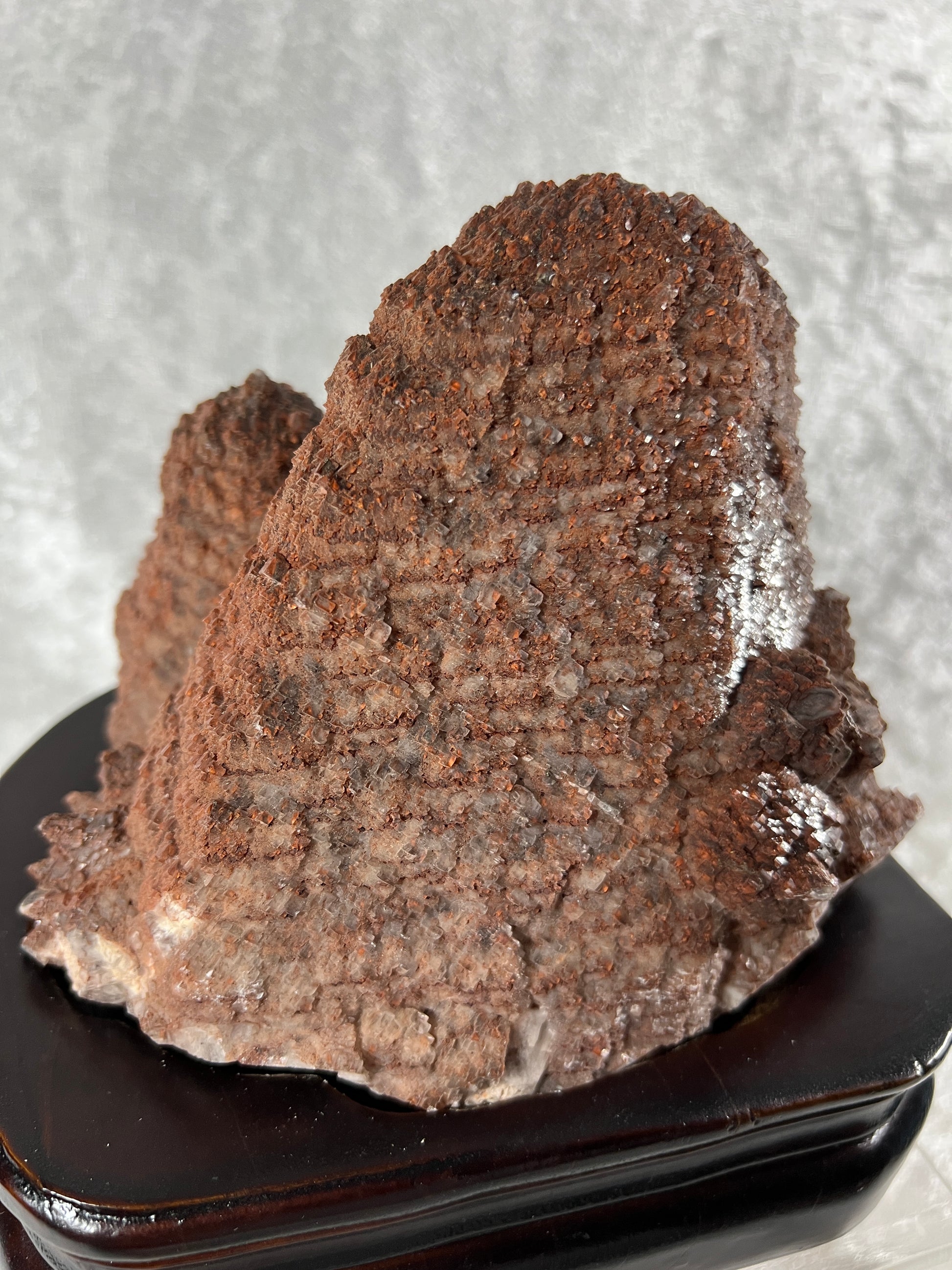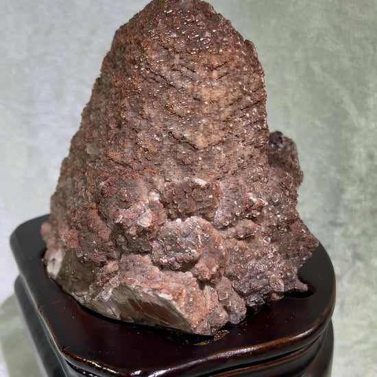 Elevate your collection with this stunning Red Pagoda Calcite. The extra large, cabinet display crystal boasts amazing iridescent flash and rare hematite inclusions. This piece comes with a custom-made wooden stand, making it a truly unique and exclusive addition to your decor. A true statement piece. The sizes and weights are for the crystal only.
