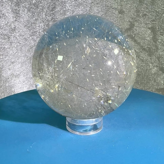 Elevate your space with our luxurious Rutile Quartz Sphere. Expertly crafted with high quality Golden Rutilated Quartz, this stunning display sphere boasts gorgeous rainbows and intricate gold rutile inclusions. Bring a touch of sophistication and elegance to any room with this unique and exclusive piece.