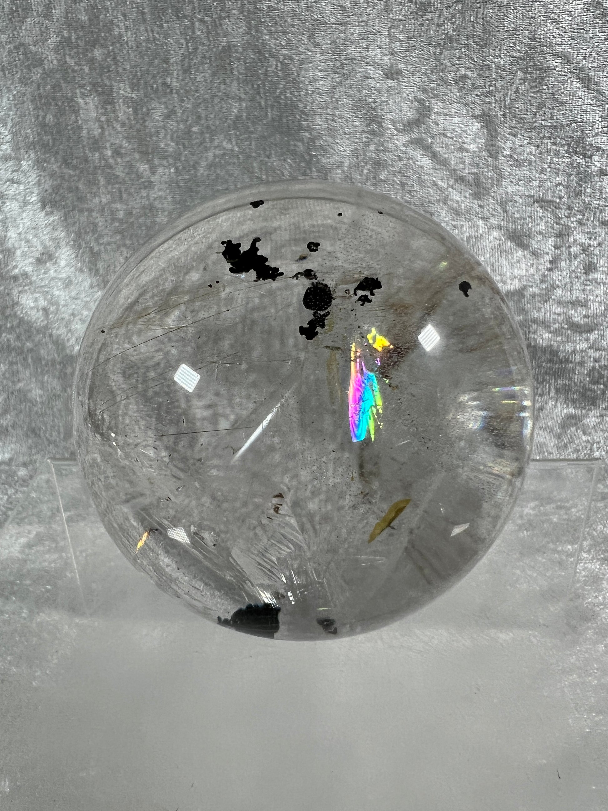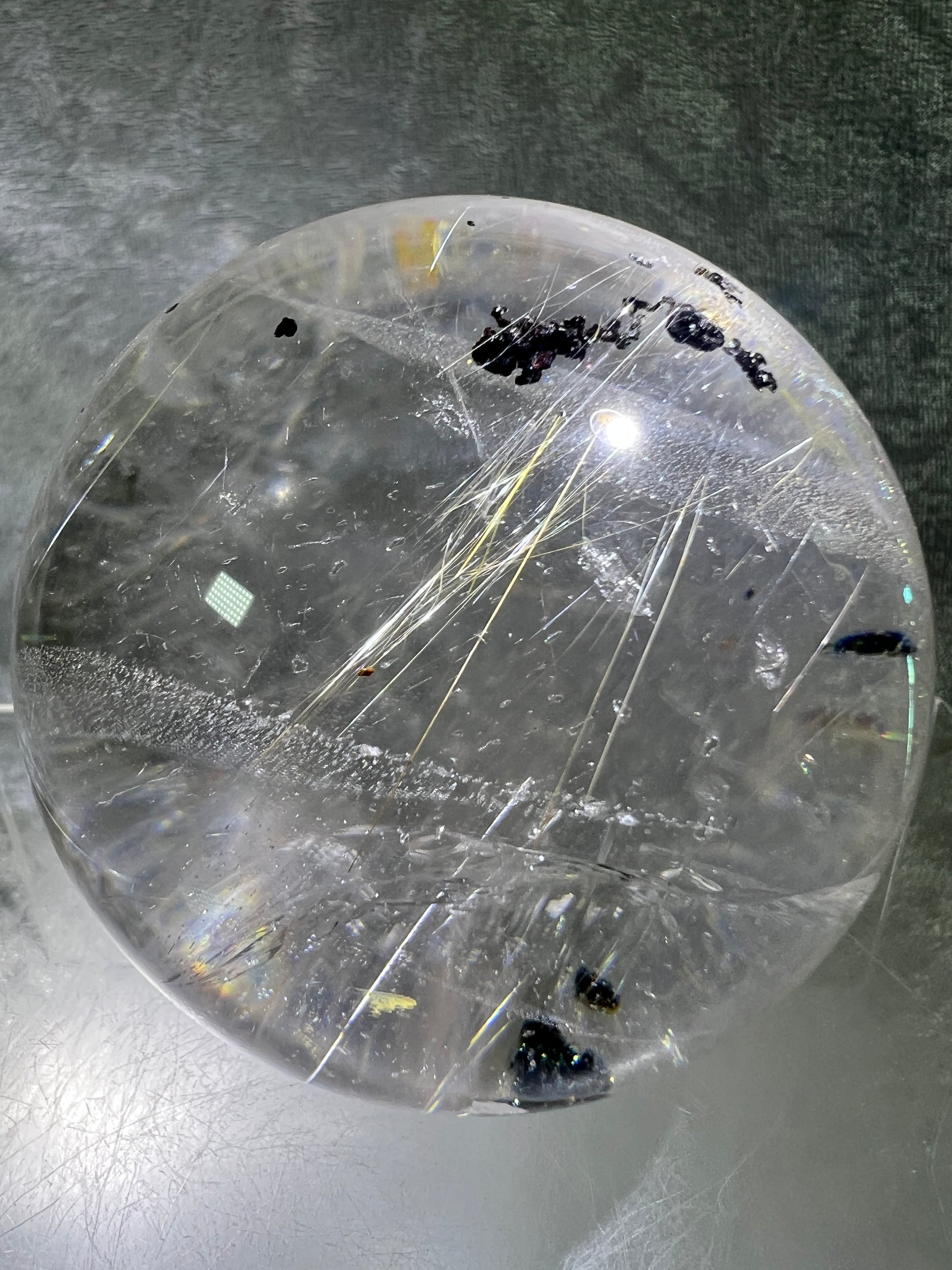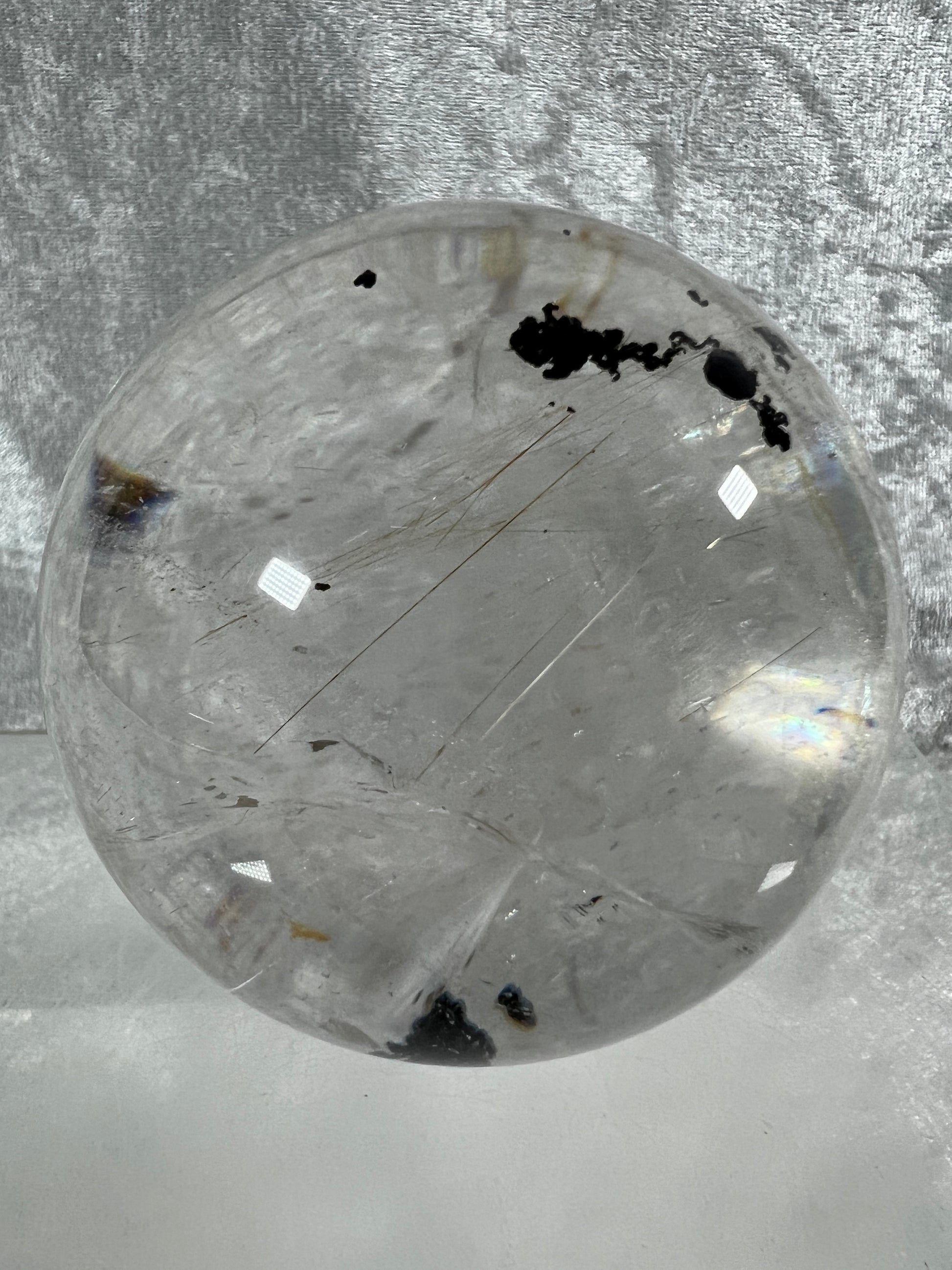 This stunning Rutile Quartz Sphere is a treasure for any collector or lover of luxury. Its large size, very high quality, and rare golden rutile inclusions make it an exquisite addition to any display. The mesmerizing rainbows and garden Quartz add a touch of natural beauty to this already gorgeous piece.