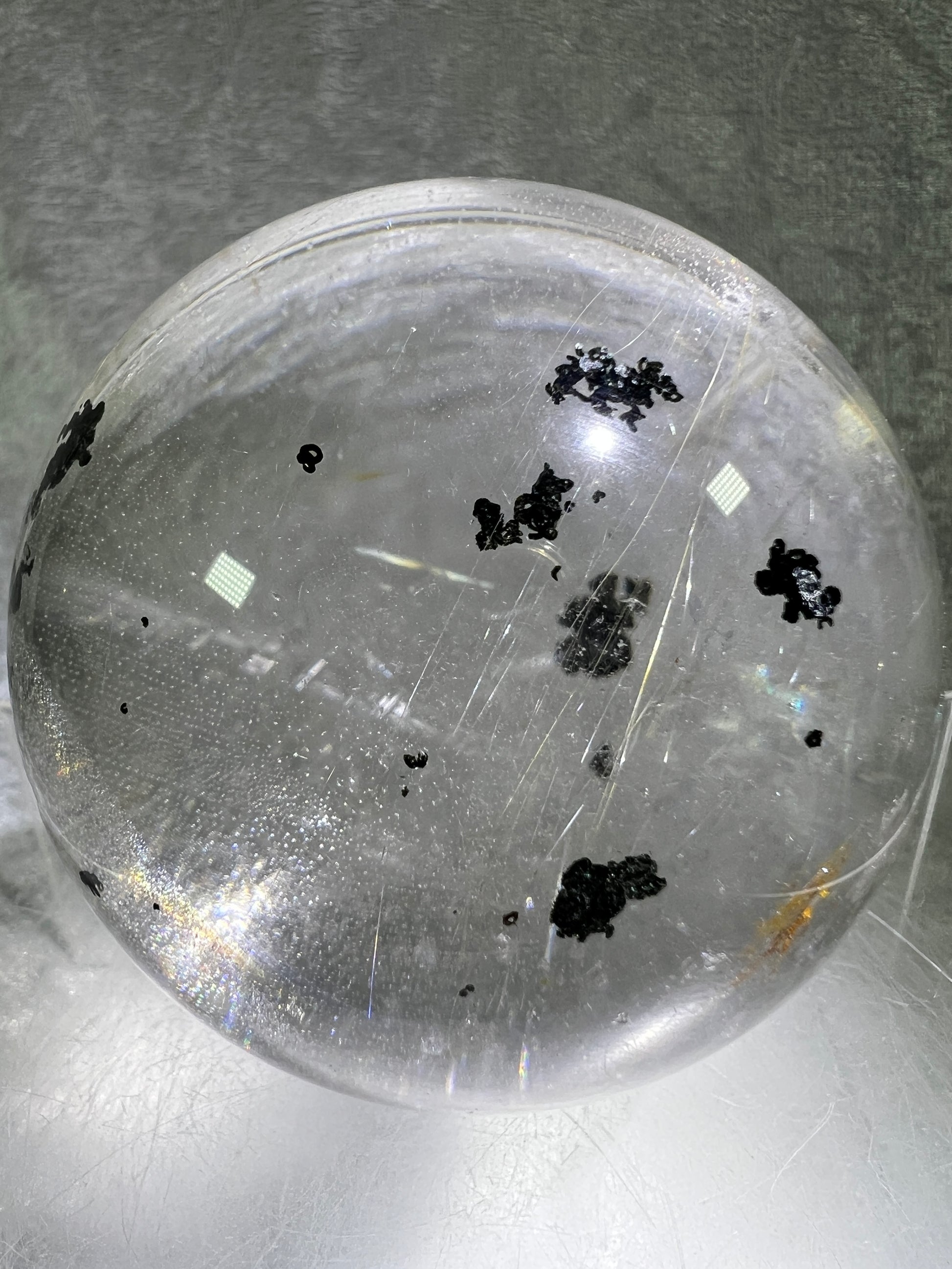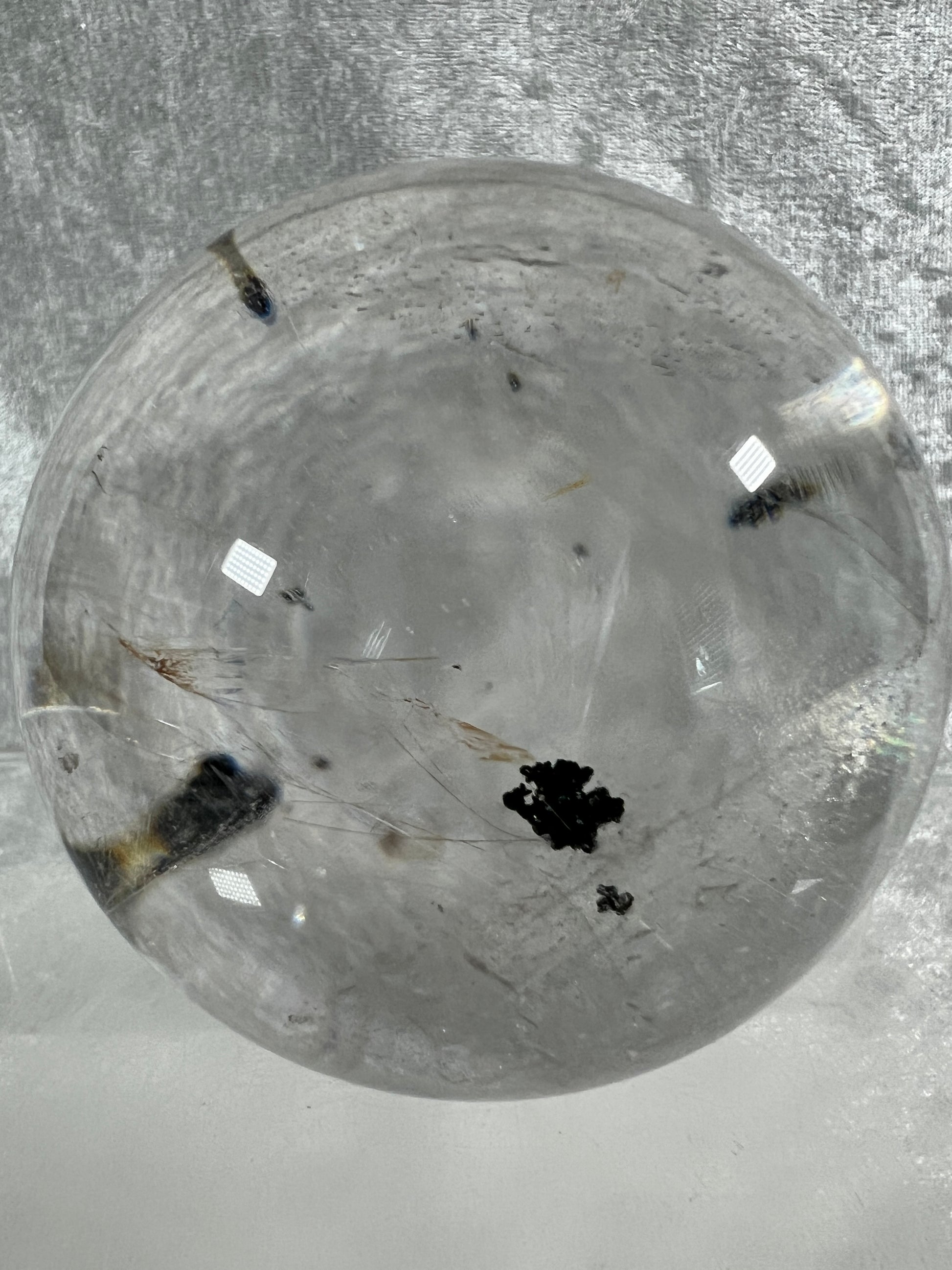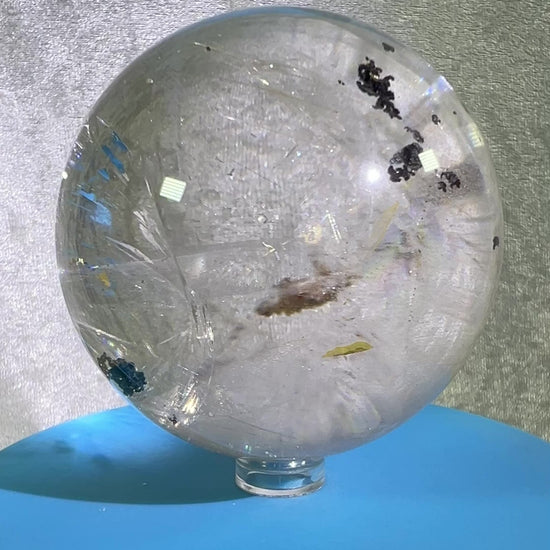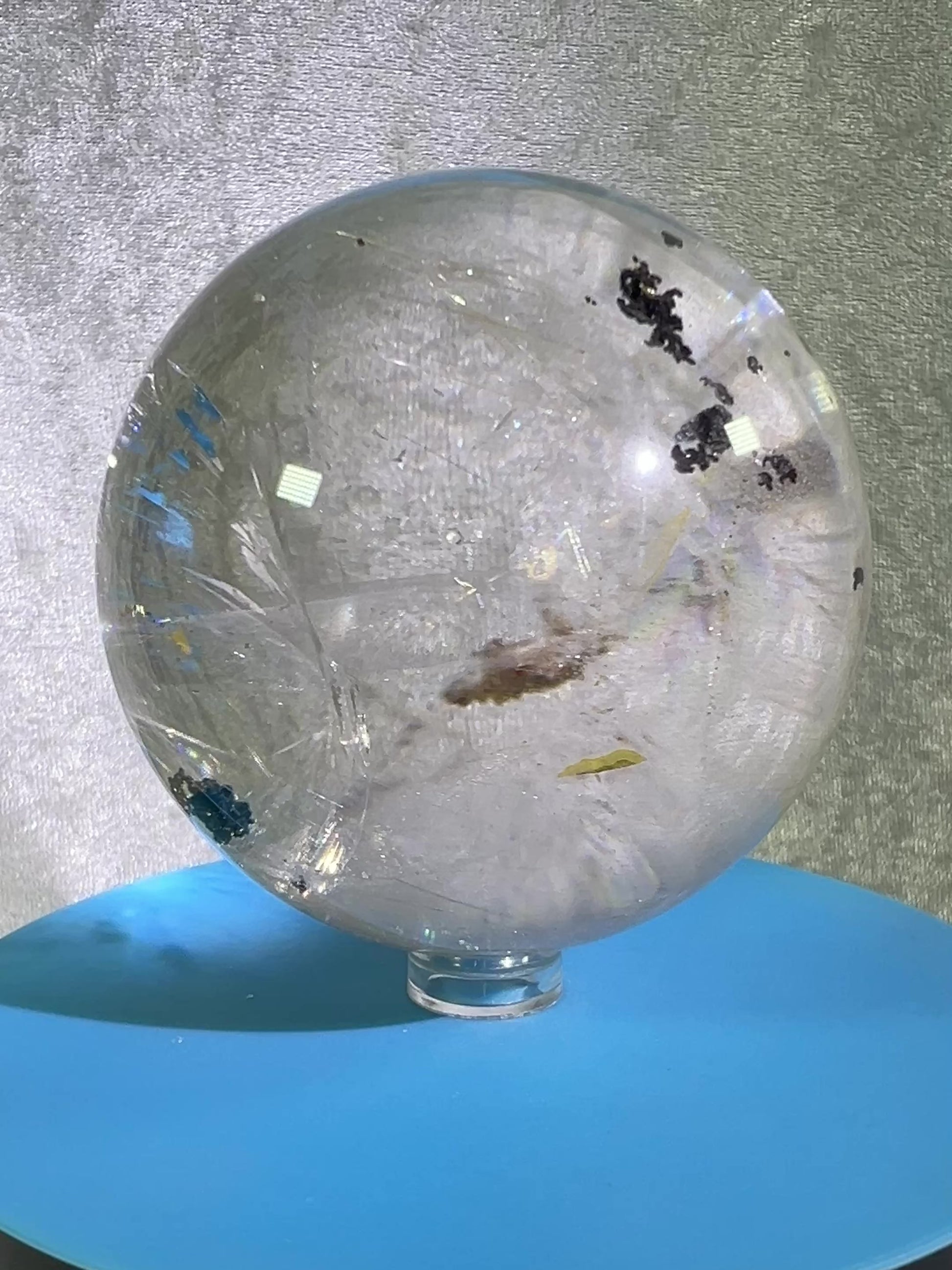 This stunning Rutile Quartz Sphere is a treasure for any collector or lover of luxury. Its large size, very high quality, and rare golden rutile inclusions make it an exquisite addition to any display. The mesmerizing rainbows and garden Quartz add a touch of natural beauty to this already gorgeous piece.
